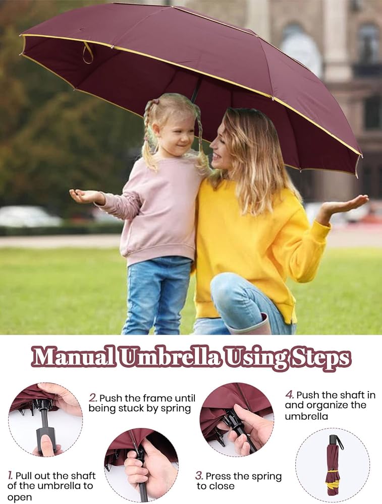 √ Manual Open/Close and Reflective Strip: Avoid the automatic function easy to break of the common shortcomings from the automatic umbrella. You can manually open/close 100,000 times. The probability of failure is 1/10 of the automatic umbrella.One more outstanding feature we designed:Using Our Umbrella WITH THE YELLOW STRIP, just a weak light can be reflective at night.That's Why We Choose KALOLARY Umbrella.