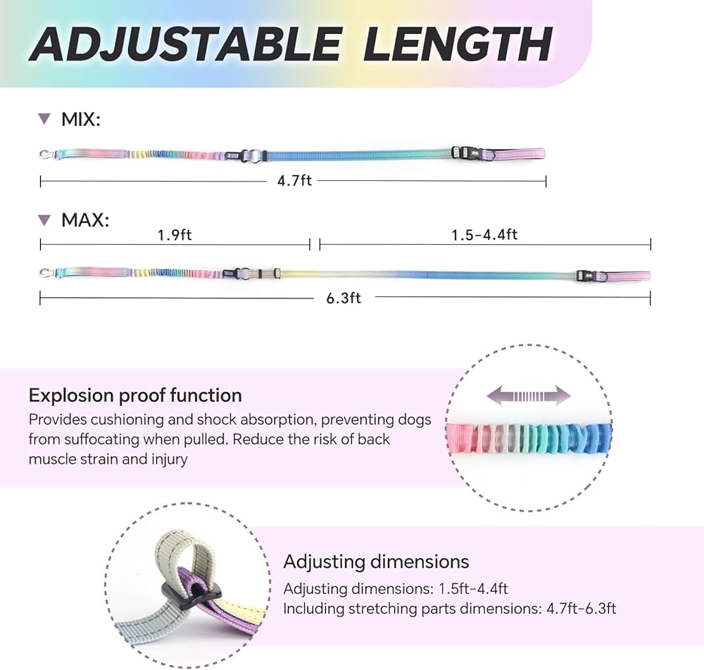 Dog Running Leash Hands Free: This heavy duty waist leash for dog is made of durable nylon material, lasting longer easily; The no-hands provides plenty of free space and the bungee leash stretches out to 6 feet. Adjustable waist belt suitable most peoples for a completely hands-free walking, It's perfect for running, hiking or biking. Bungee design it helped dog learn the distance control,which gives your dog enough room to run by your side.