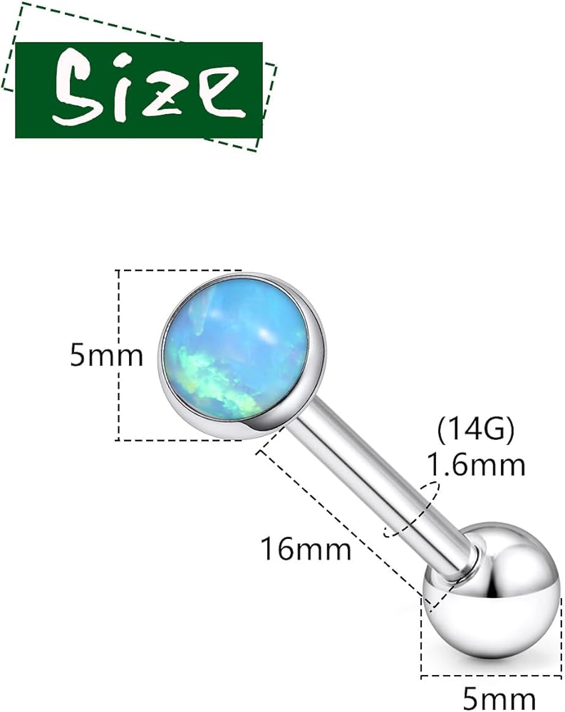 The bar diameter is 14G(1.6mm), the bar length is 5/8inch 16mm, Screw Threaded ball ends, easy to screw on and screw off.
