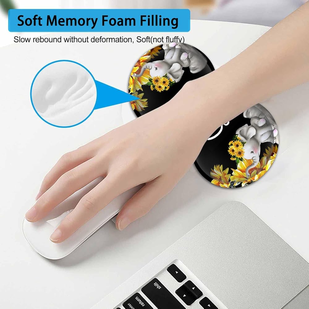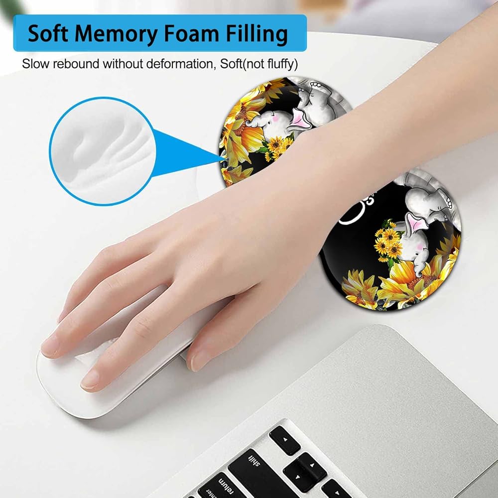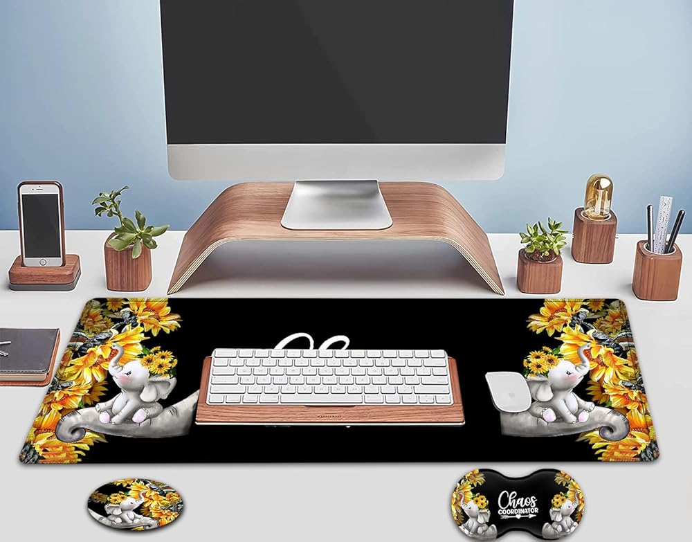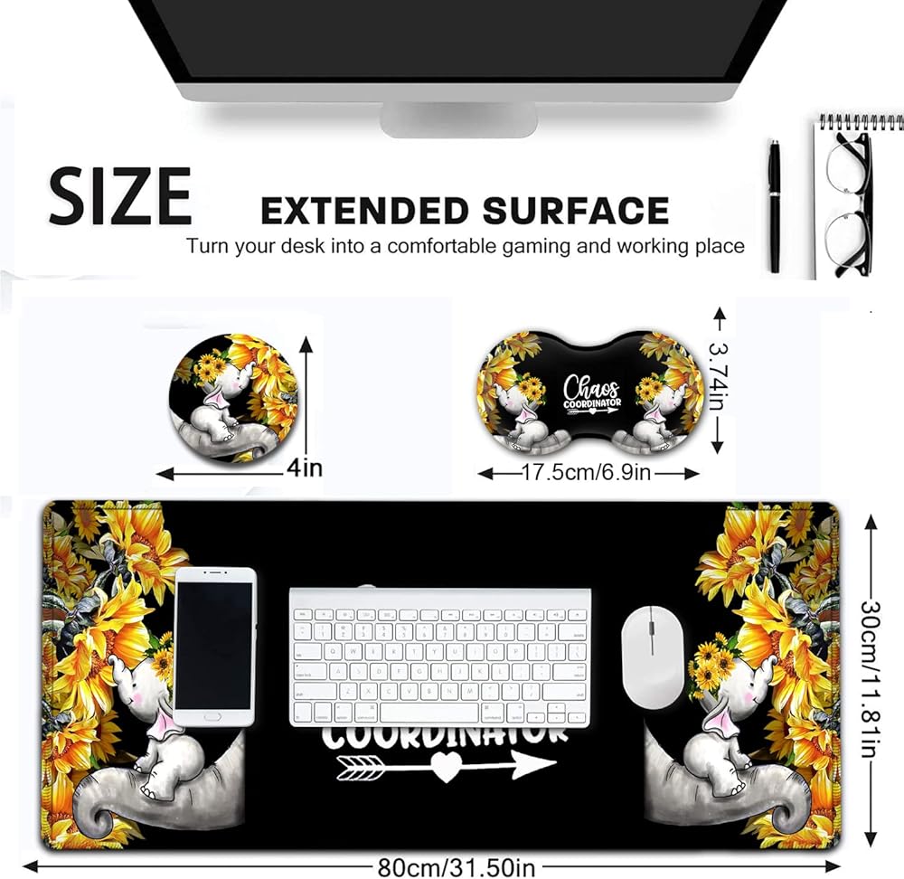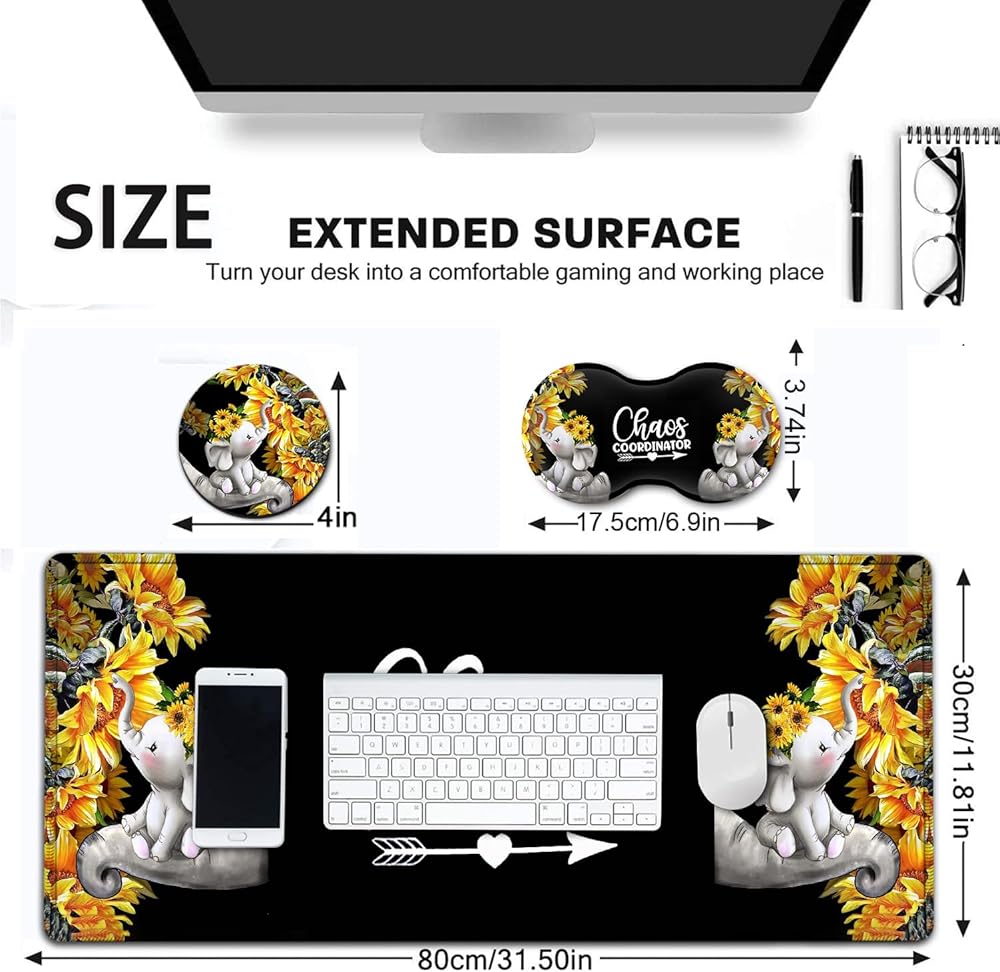 Large Mouse Pad, Extended Office Desk Pad, 31.5x11.8in, Ergonomic Memory Foam Mouse Wrist Rest Support for Home Office Computer Writing Pad Cute Baby Elephants + Sunflowers XXL Black Gaming Mouse Mat