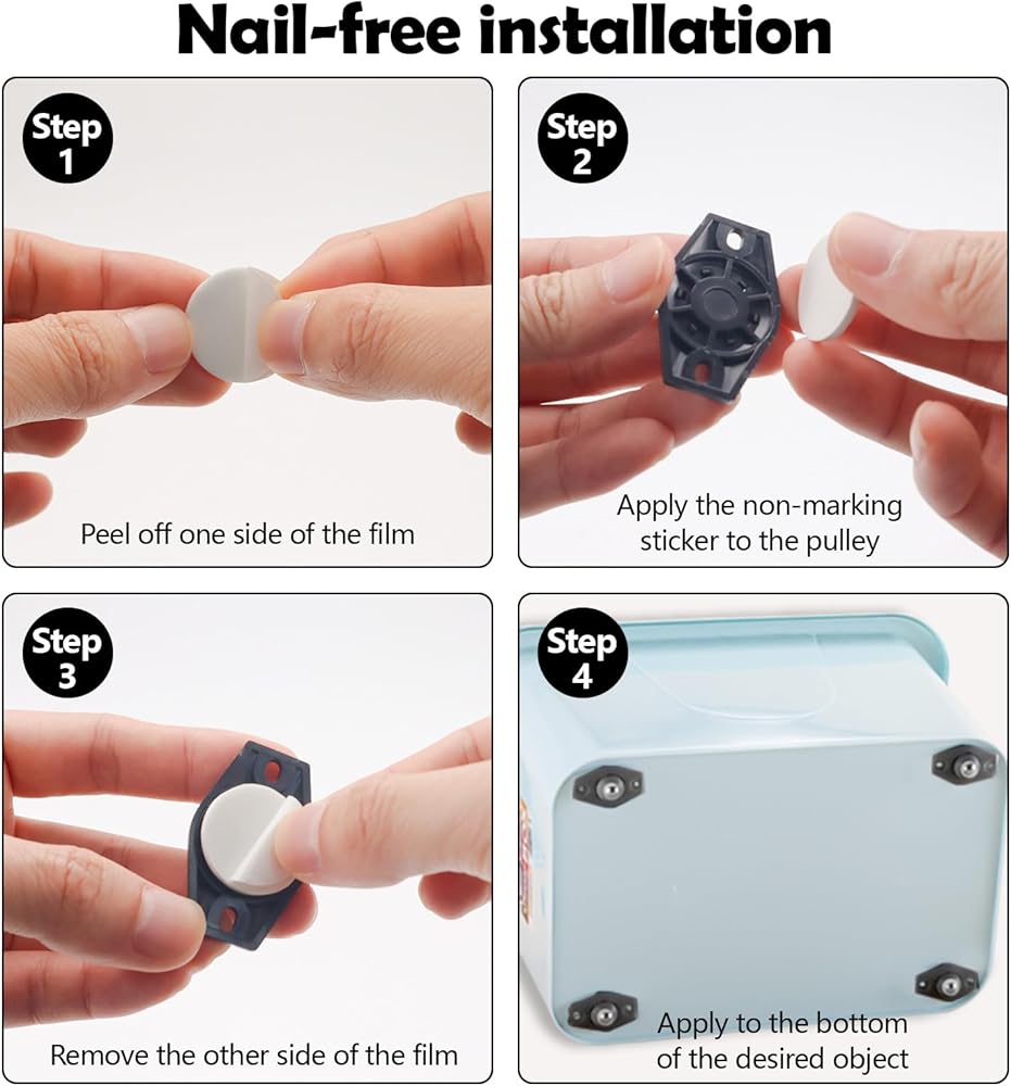 Note: Rotation sticky pulleys have fixing holes, you can also use nails or screws to secure them.