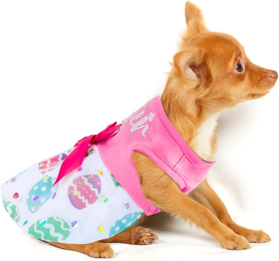 Dog Easter Outfit---Elastic waist design fits most different size dogs with good elasticity. The cute happy easter dog dress is available in a variety of styles, sleeveless design, pullover style can make it easy for your dog to put on and take off, and the colorful easter bunny eggs elements can make your dog be the most charming and beautiful one in the party! Suitable for / Yorkie / Maltese / Bichon / Shih Tzu / Small Poodle / West Highland White Terrier / Pug, etc.