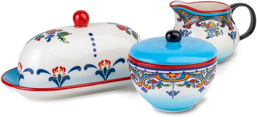 【Dimensions】Creamer (5.5" x 2.5" x 3.5"),Sugar Bowl with Lid (4.25" x 4.25" 3.5"), Butter Dish (8.77" x 4.94" x 4.23")
