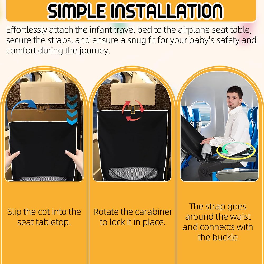 SIMPLE INSTALLATION - Effortlessly attach the infant travel bed to the airplane seat table, secure the straps, and ensure a snug fit for your baby's safety and comfort during the journey.