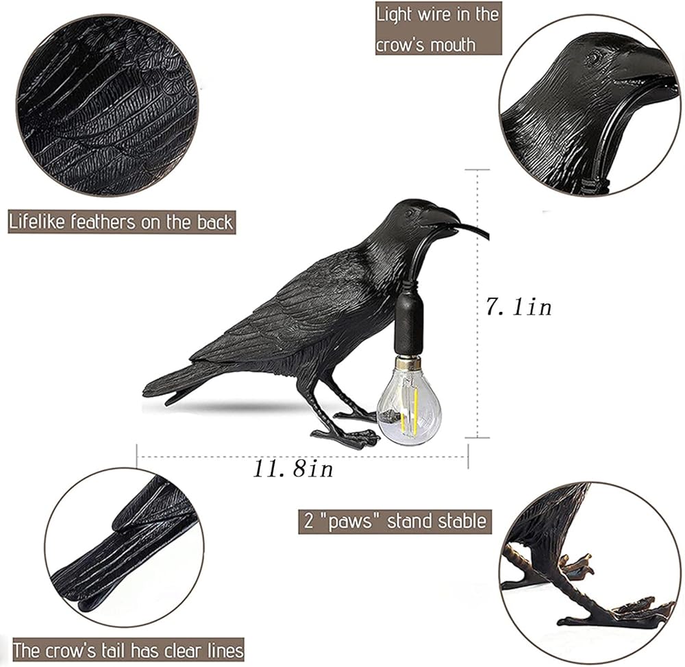 Features: The Raven Lamp has realistic details, delicate feather patterns, lifelike claws and cute little eyes, just like a real crow sitting there.