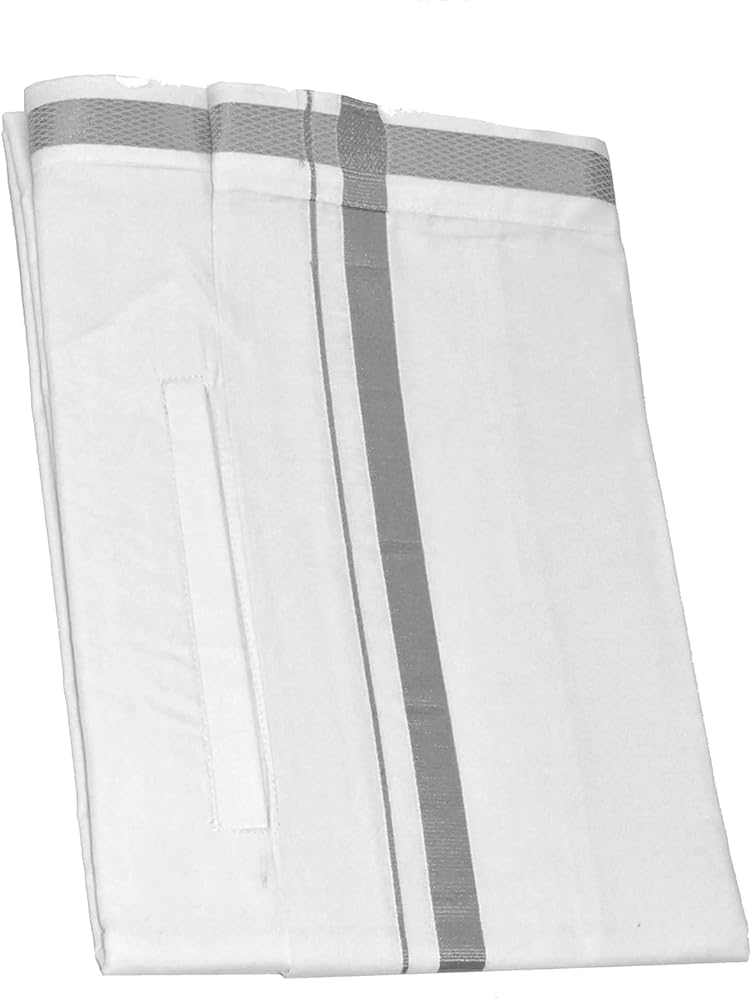 Kolakeer™ Men's Easy-To-Wear Welcro Zari Border Cotton Dhoti with Pocket - Adjustable from 28 to 38 inch Waist Size