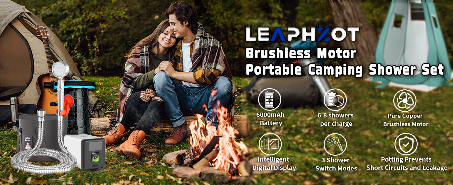 6000mAh High-Capacity Lithium Battery Rechargeable Shower - The LEAPHZOT outdoor camping shower comes with a USB rechargeable 6000mAh battery,Fully Charged for 8-10 Showers with a full charge by power bank, phone adapter, laptop, car USB output. The integrated battery is more convenient to recharge by uncovering the waterproof cap of charging port, and has longer service life as it can avoid problems of loose contact and worn interface like other split type batteries.