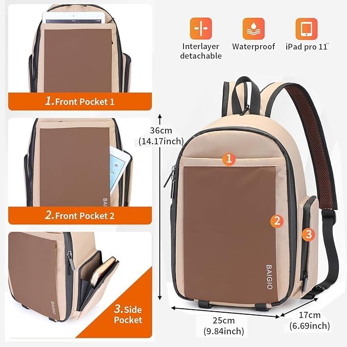 【Sufficient Capacity】Dimensions: 35 x 20 x 15 cm. This camera sling backpack features a main compartment that accommodates 1 DSLR + 2-3 lenses + an 11-inch iPad. There's a shock-absorbing layer inside the main pouch. The travel camera backpack has a front pocket and a hidden zipper pocket for storing books, tissues. There is also a small zipper pocket on the side for accessories like mobile phones, power banks, etc. At the back of the camera bag, there is an anti-theft zipper pocket.