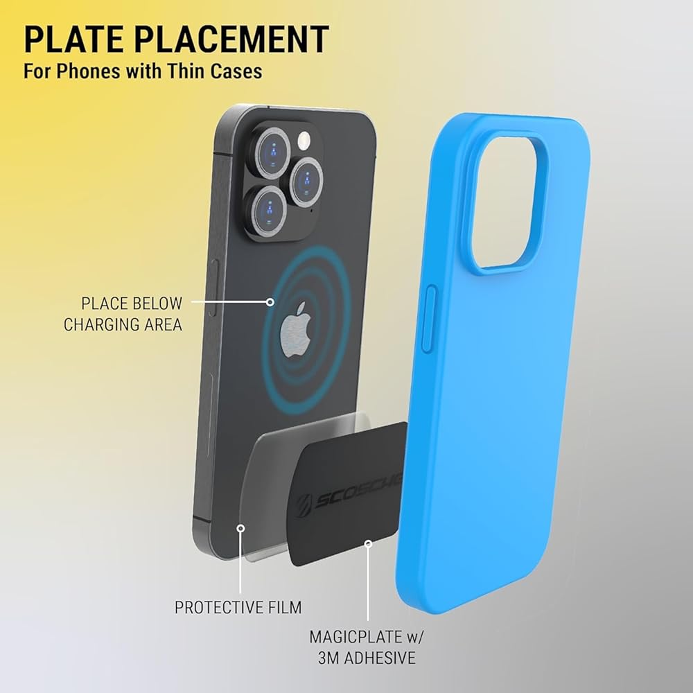 MagicPlate Placement: To achieve a strong hold with larger and heavier cell phones or tablets, place the extra strength Scosche MagicPlate directly on your device or on the exterior of the case. Refer to the images for recommended placement of your metal plate for magnet phone mount holder and enjoy magnetic mounting without interfering with wireless charging.