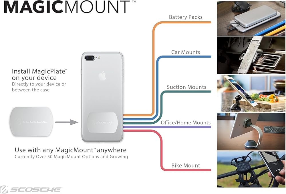 Universal Compatibility - Whether using a magnetic phone mount for your car dash, vent, CD slot, windshield, or any flat surface, our heavy duty metal plate pads securely attach to the magnets in your mount. These extra strength plates are the perfect solution for hands-free use of your cell phone or tablet, and ideal for any of our Scosche MagicMount magnet mounting systems.