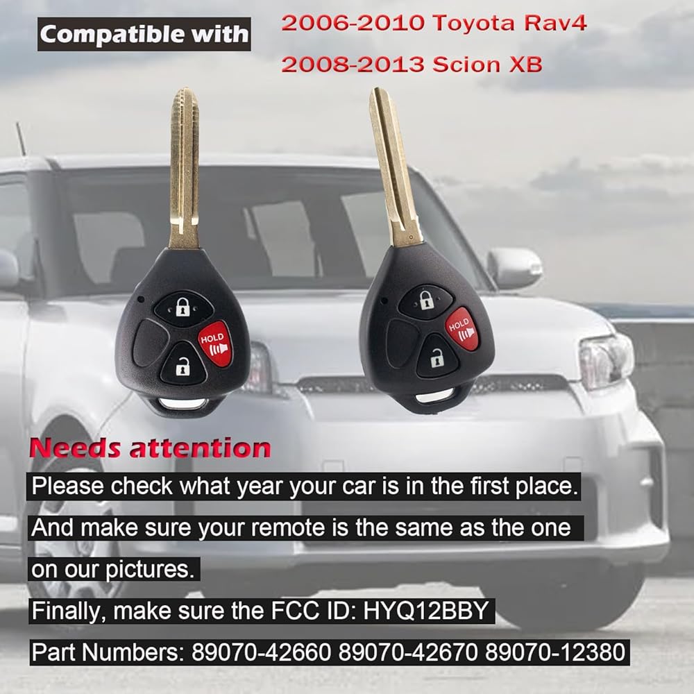 【Applicable models】:This is a remote replacement compatible with 2006-2010 Toyota Rav4/2008 2009 2010 2011 2012 2013 Scion XB.This remote is 4D67 chip (also called "H chip"). It will not work for the key Has a "G" stamped on the metal key blade.Please be sure to check the year, model, and FCC ID carefully before purchasing.