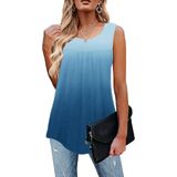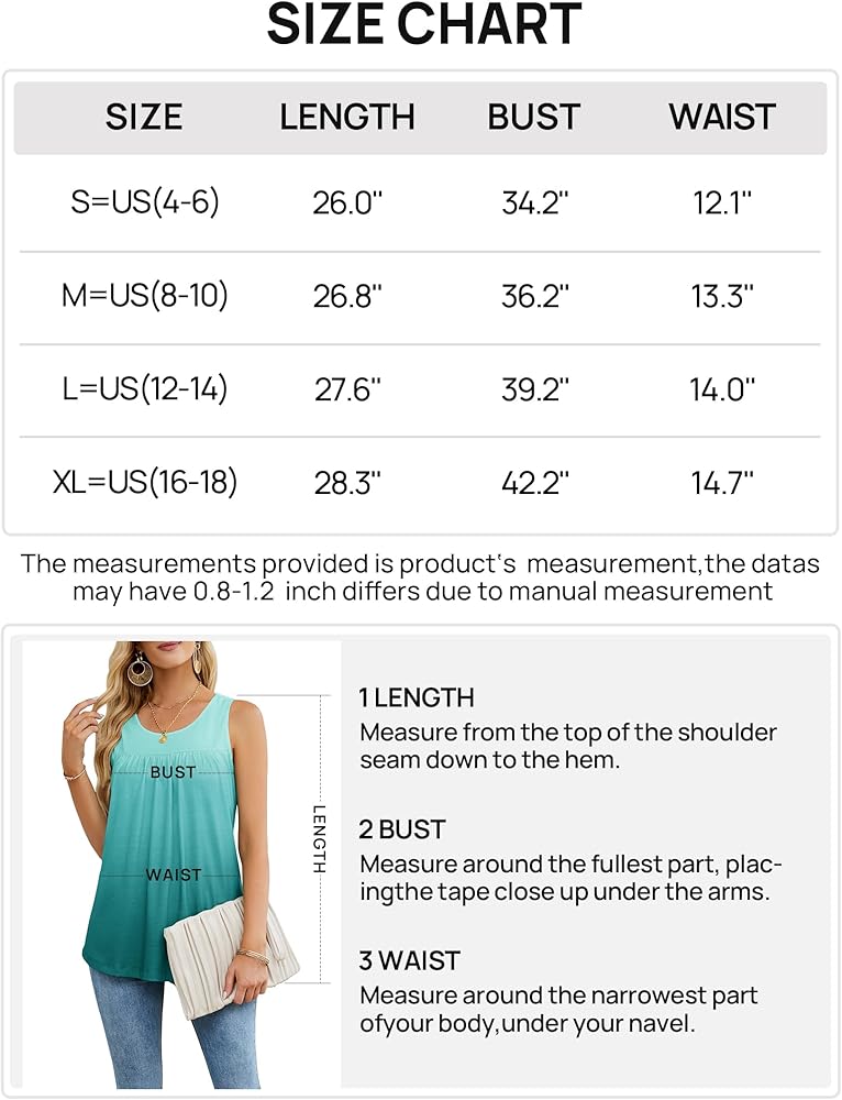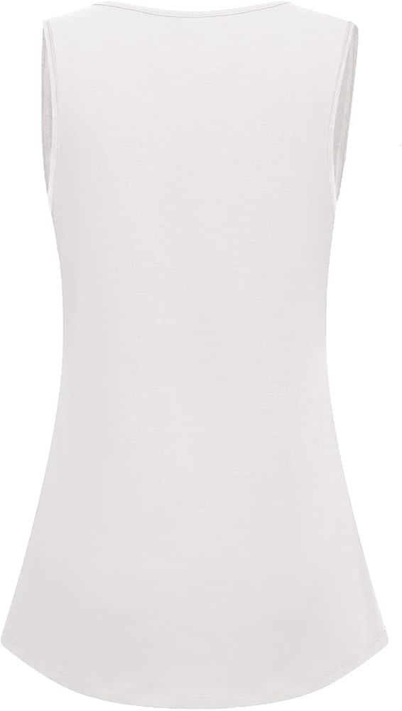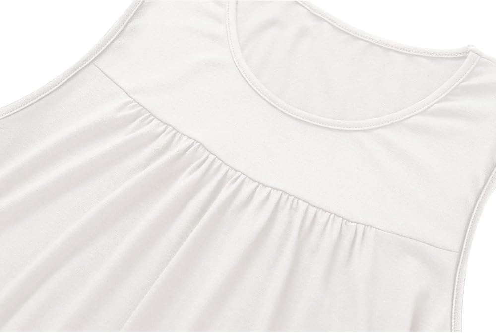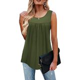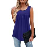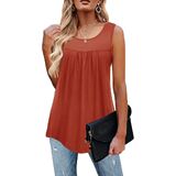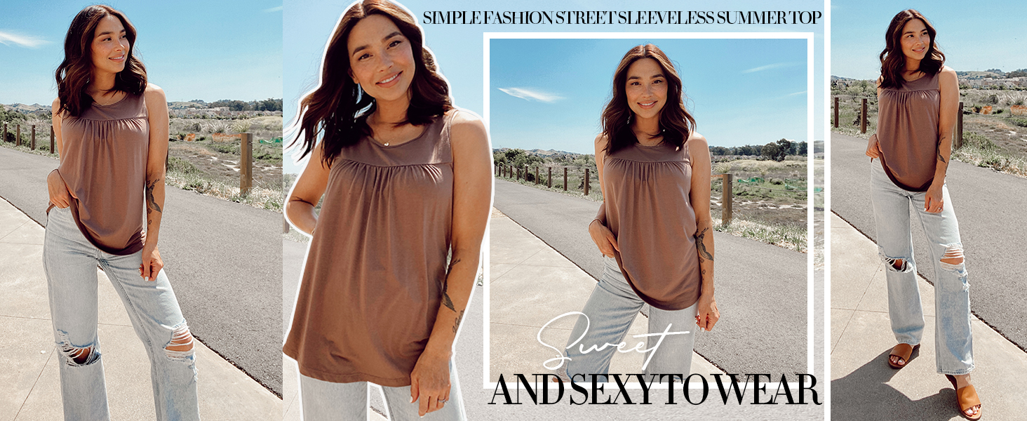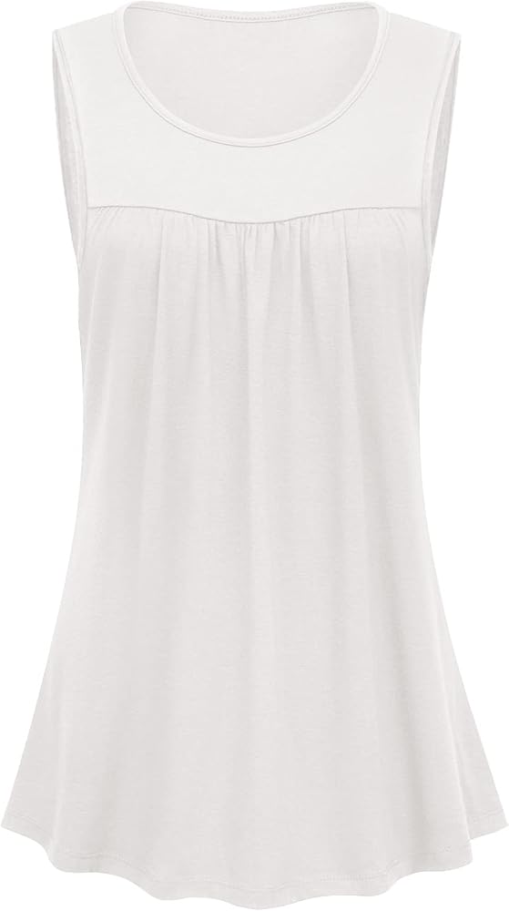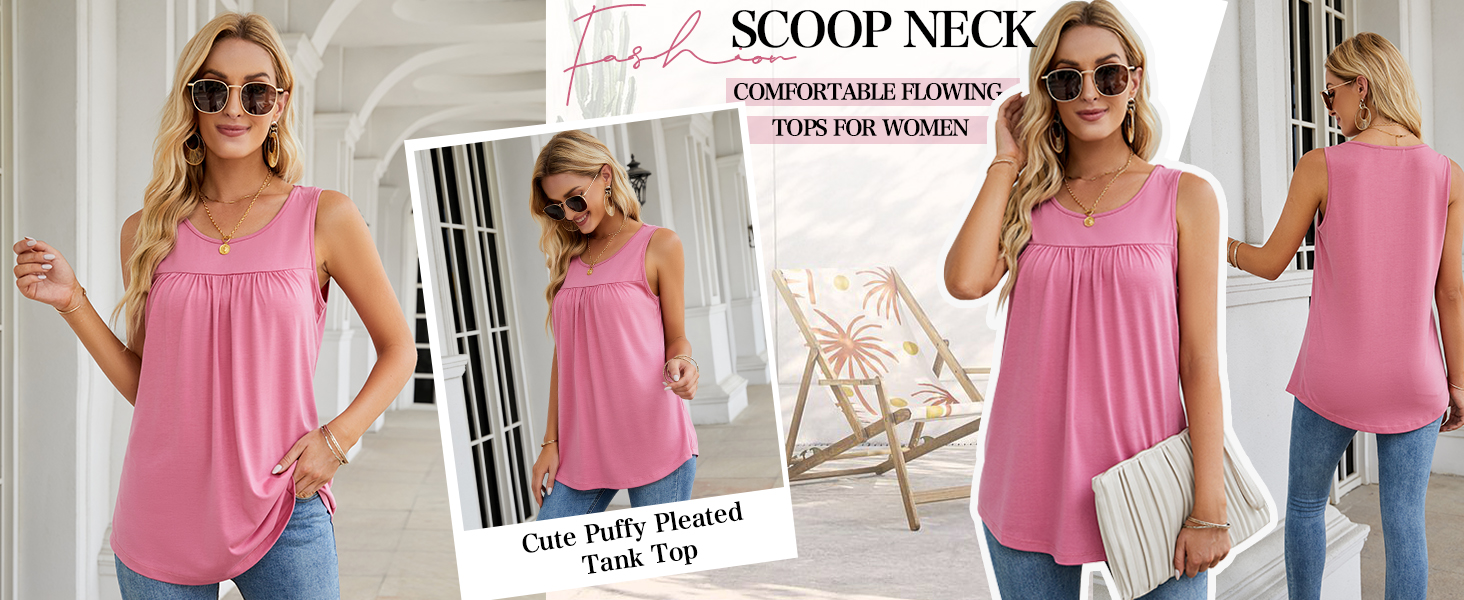 Casual sleeveless tunics style, scoop neckline, pleated design in the front, flowy loose, flared fit, dropped back hem for enhanced coverage.