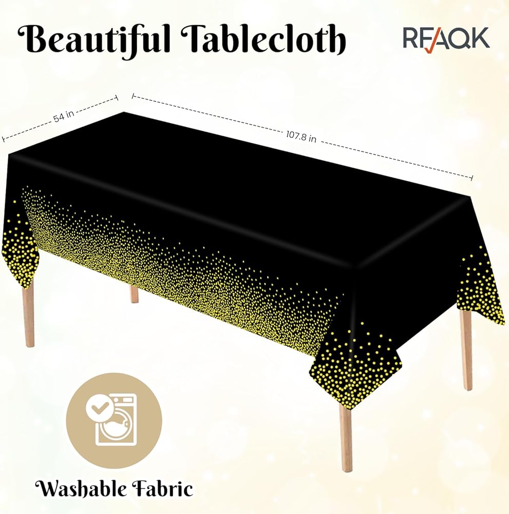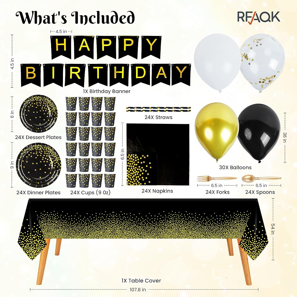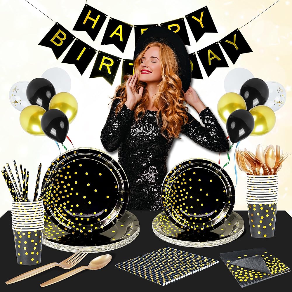 200PCS Black and Gold Party Supplies, Disposable Party Dinnerware Gold Plastic Spoons and Golden Dot Black Paper Plates Napkins Cups Banner for Birthday, Graduation and Wedding Party, Severs 24 Guests