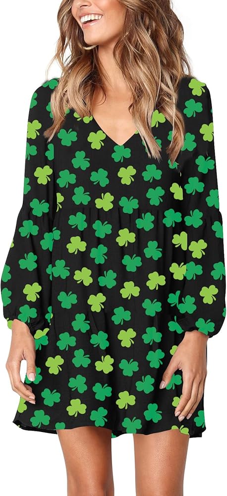 Roshop St Patricks Day Dress Women Bell Sleeve V Neck Cute Lucky Green Clover Irish Shamrock Holiday Dresses