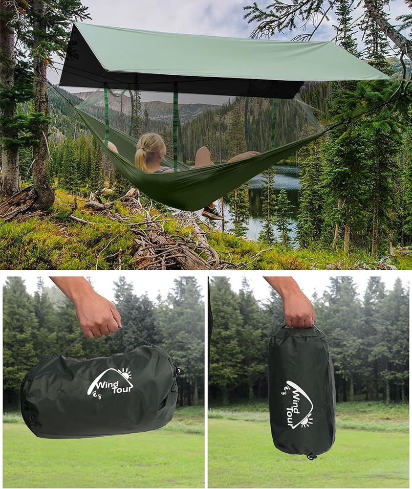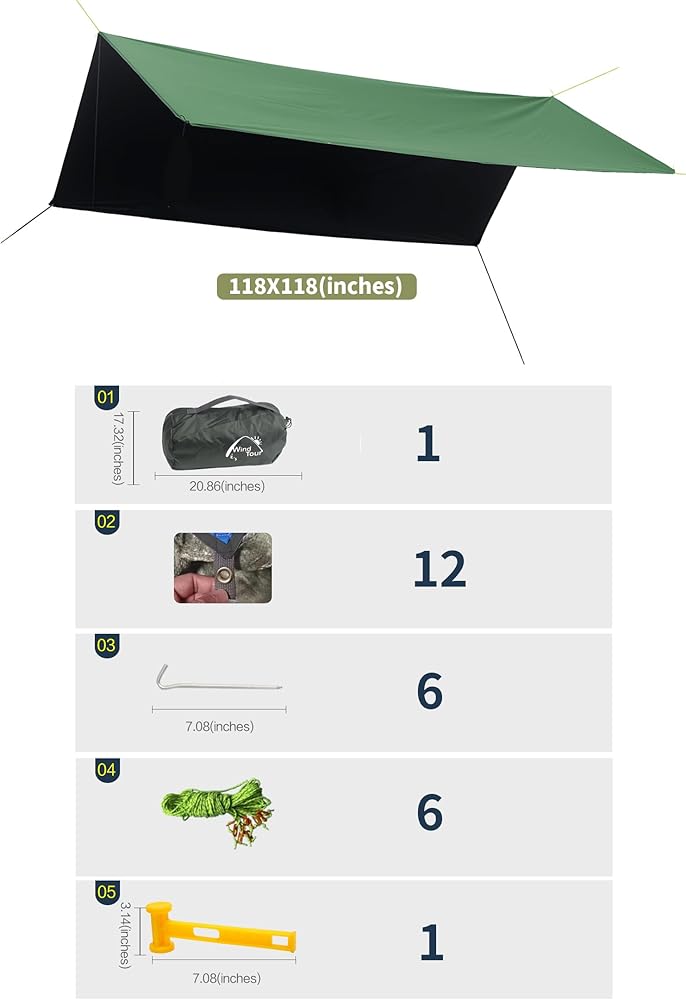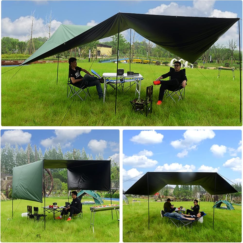 WATERPROOF & UV PROTECTION - Tarp tent made of 190T ripstop polyester fabric with 3000 PU waterproof and black glue coating. Not only is it a good shelter on rainy days, it can also block ultraviolet rays well on sunny days to prevent the skin from being exposed to the sun.