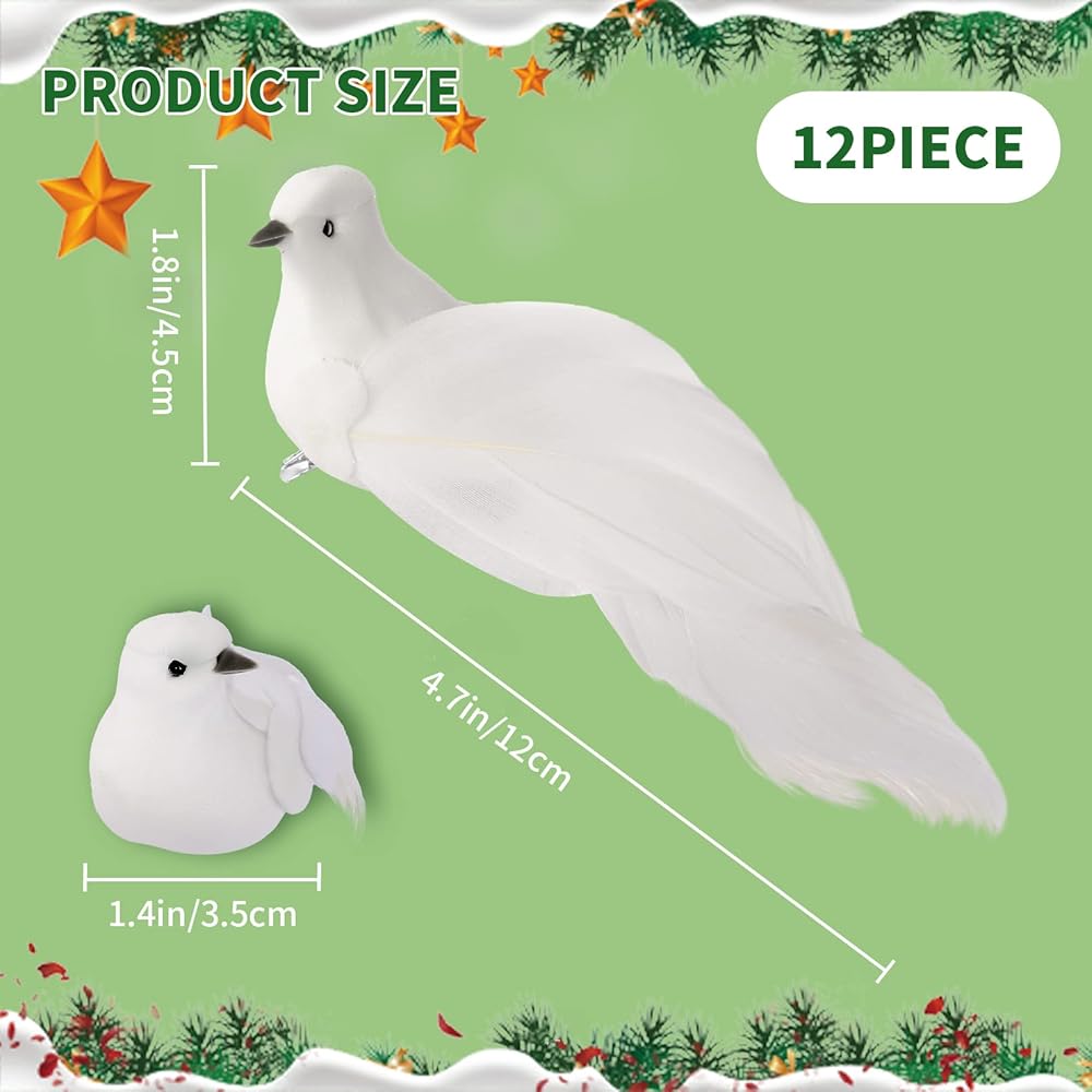 12 Pcs Artificial White Doves,Christmas Dove Birds with Clips,Artificial Birds for Christmas Tree Ornaments,Simulation Foam Feather Bird,White Feathered Mini Birds for Home Wedding Decoration. (White)