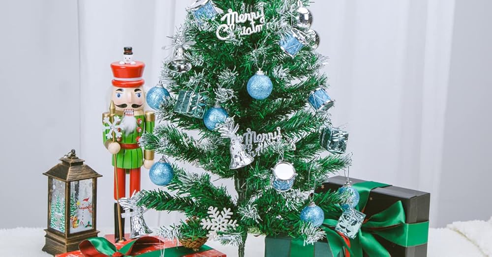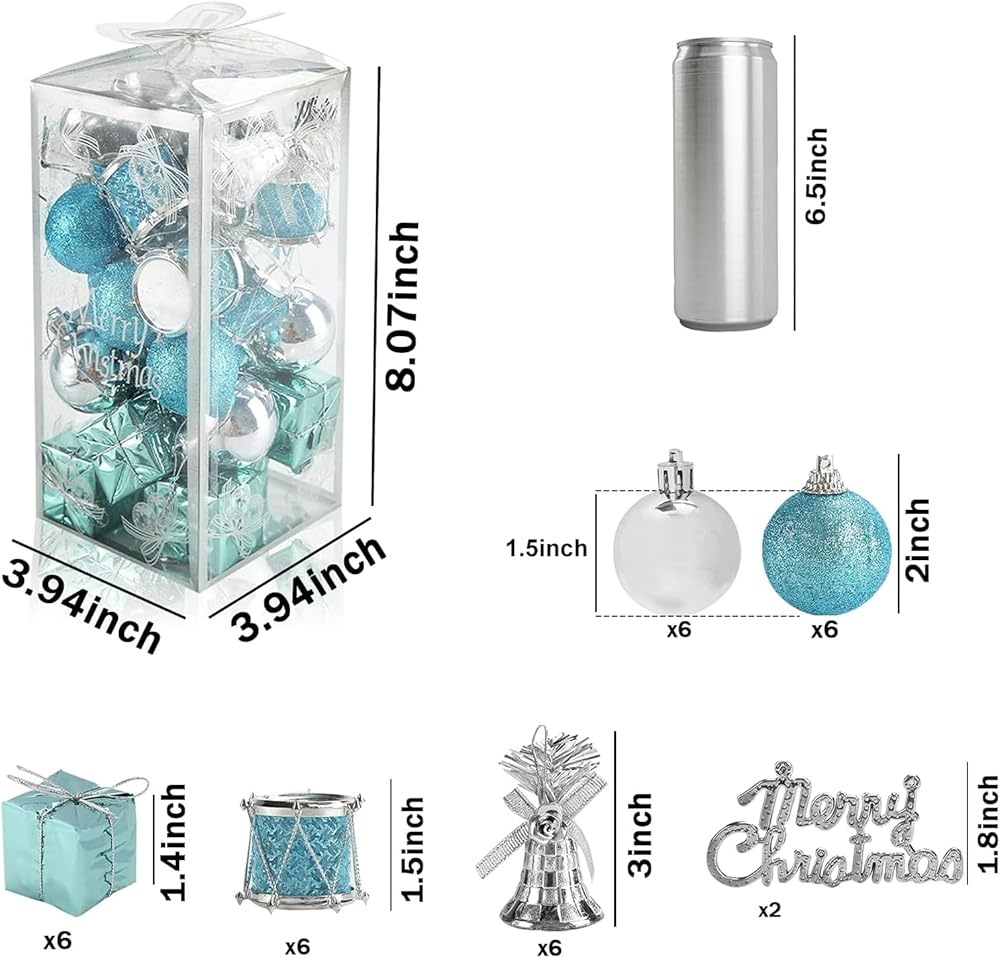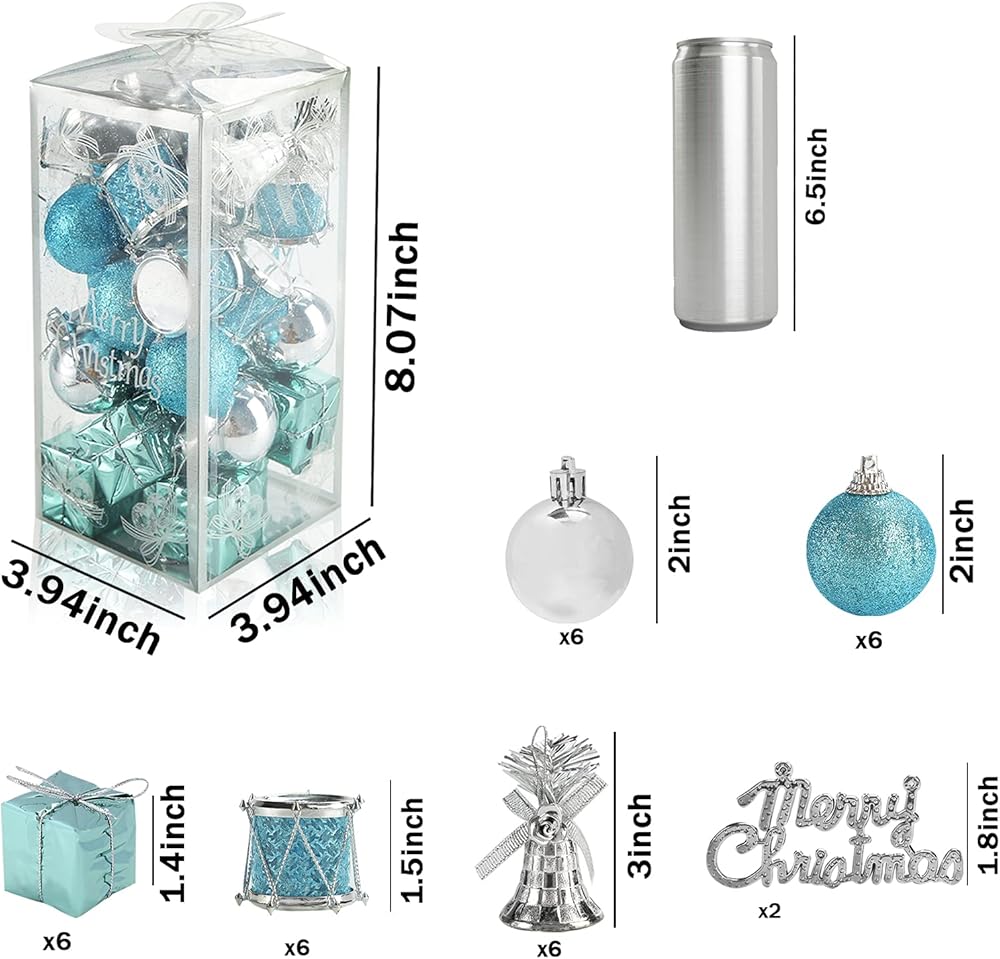 Package Listing: 6 x Christmas Balls Blue, 6 x Silver Ball, 6 x Gift Box, 6 x Drum, 6 x Jingle Bell, 2 x Merry Christmas Card