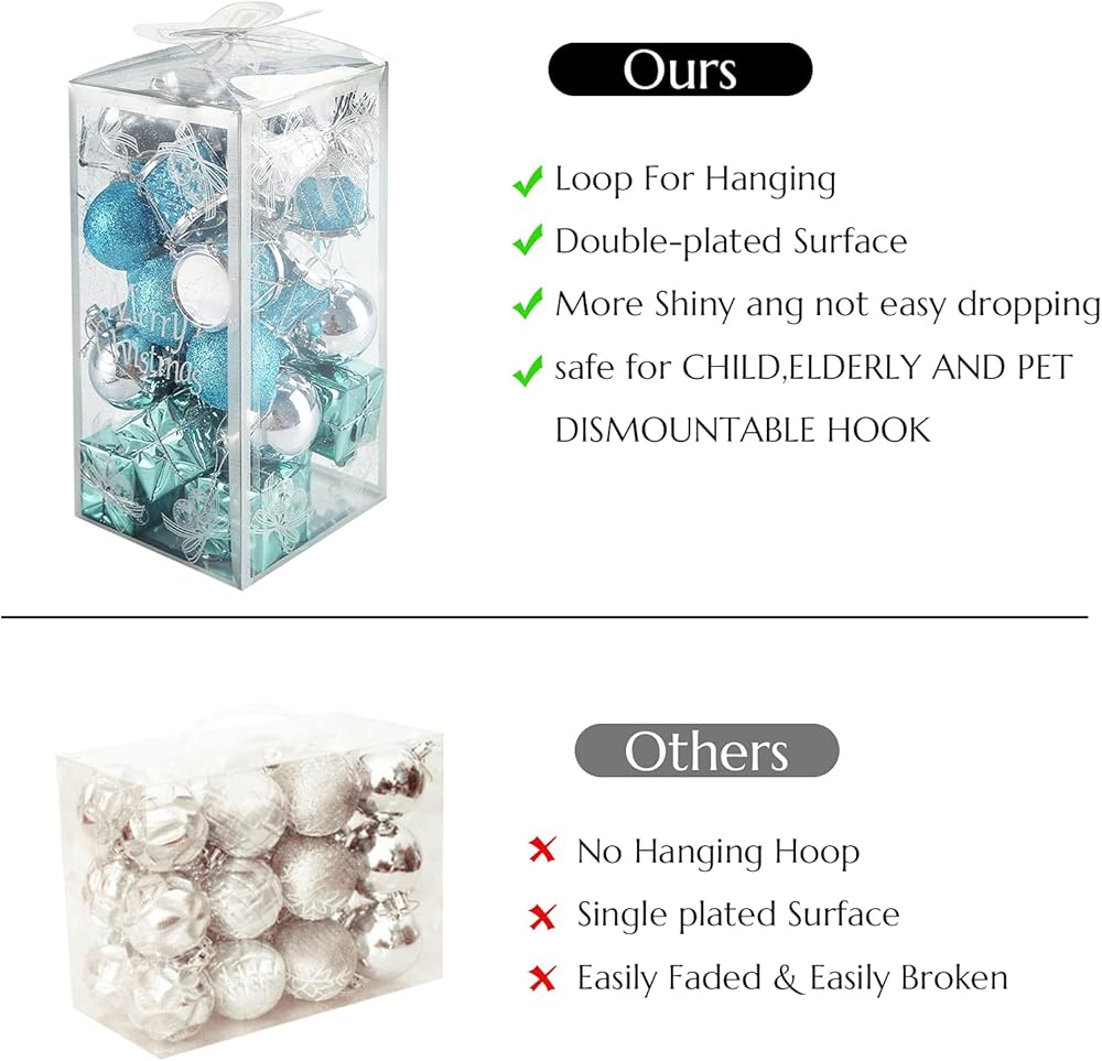 Material: These Christmas tree decorations are made of durable and eco-friendly plastic Christmas Ball Ornaments.