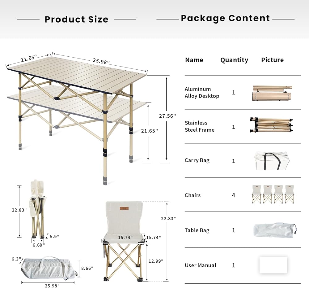 【Adjustable Height】: The height of this folding table can be adjusted from 21.65" to 27.56", making it very suitable for use on different terrains without the risk of tipping over. In addition, this table is equipped with 4 chairs, each of which can bear 330 lbs.
