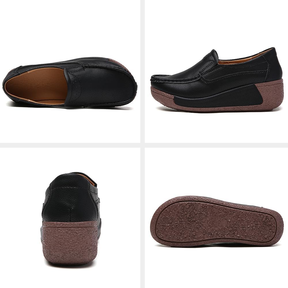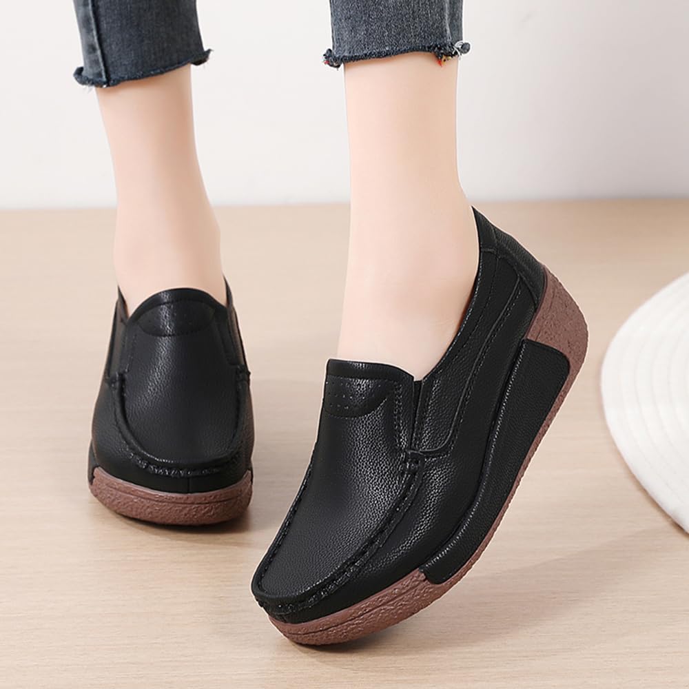 Comfortable slip-on platform loafers,easy to pull on and off. Wide round toe leather with elastic band,more flexible,super comfort work shoes.
