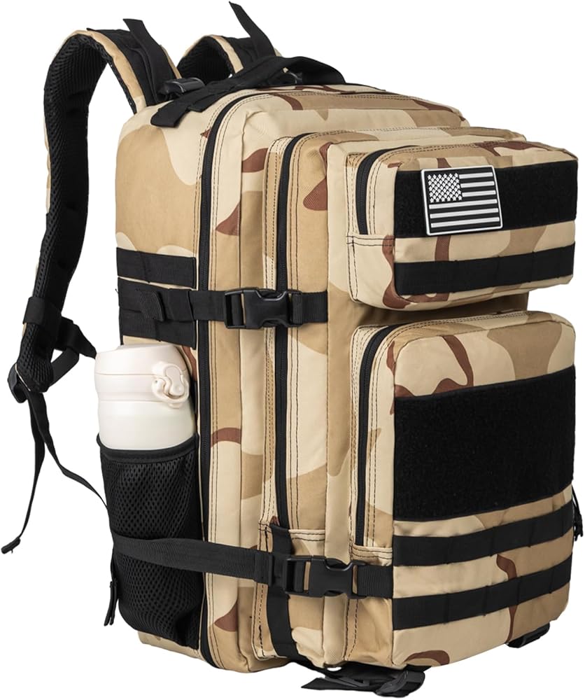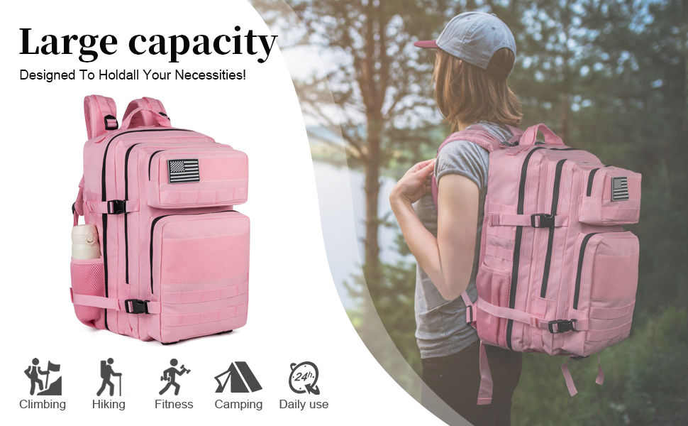 💖Upgraded Tactical Backpack for Women: We upgrade the tactical backpack according to the market situation, the size: 19.7" x 12.6" x 11.8" size and 45L capacity to meet all your needs for holding gear. At the same time, it has also upgraded and added a bottle pocket on the side that can hold an 800ml water bottle for your convenience, and there are also spacious multi-layer internal storage compartments that can accommodate a large number of outdoor equipment to meet your daily travel needs.