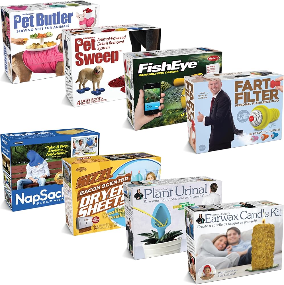 PRANK GIFT BOXES at first appear to contain bizarre products from ridiculous companies. Simply, “Put Your Real Present Inside the Joke Box" and try to keep a straight face as you watch your friends & loved ones attempt to remain gracious while thanking you for the present. Then watch them explode with laughter when they discover their actual stuff inside and realize they've been pranked. Includes 8 unique Prank Boxes. (DOES NOT INCLUDE ACTUAL ITEMS ON BOX - BOX IS EMPTY)