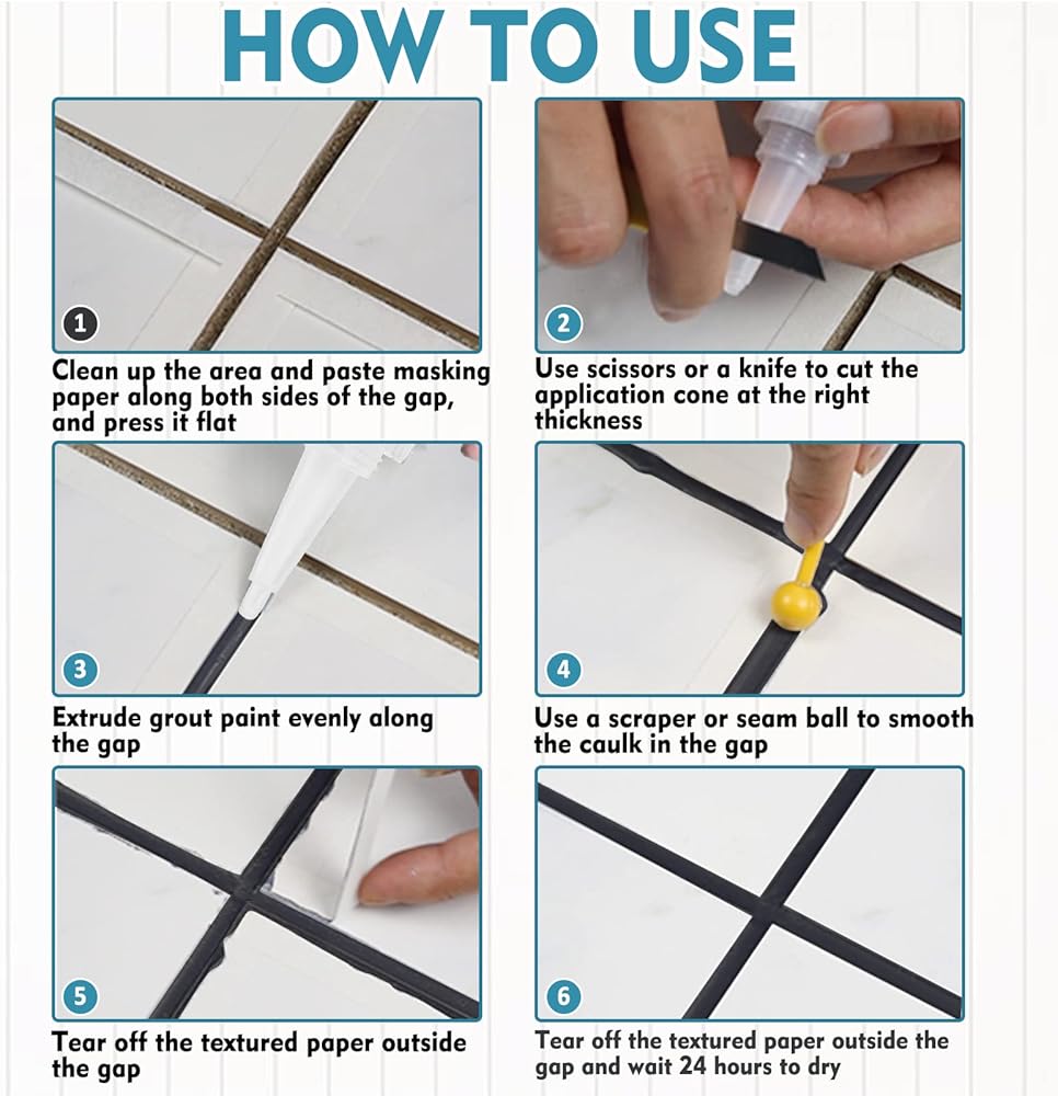 Easy To Use: Our grout sealer is simple to make your DIY effort look like a professional result. 1. Keep the area around the gap dry completely. 2. Paste the stickers along both sides of the gap, and press it flat. 3. Unscrew the cap and cut the tip at the right thickness so it corresponds with the width of the grout. 4. Extrude grout paint evenly along the gap. 5. Use a scraper or small stick to smooth the caulk in the gap. 6. Tear off the stickers outside the gap and wait 24 hours to dry.