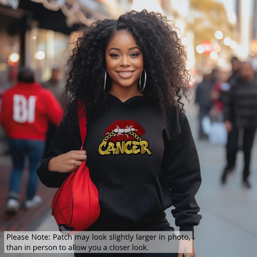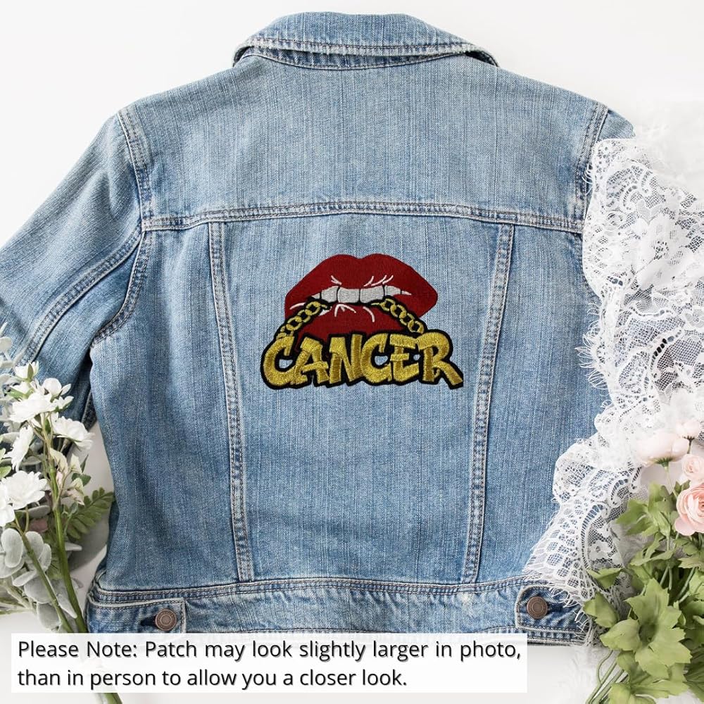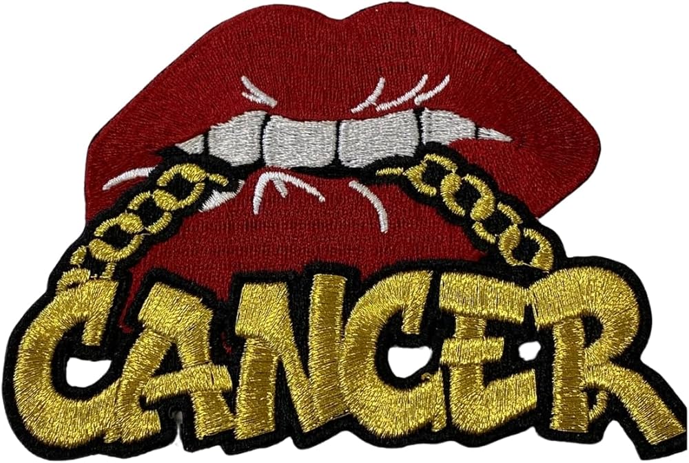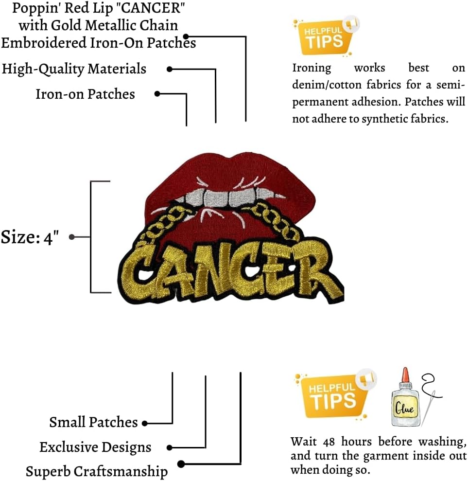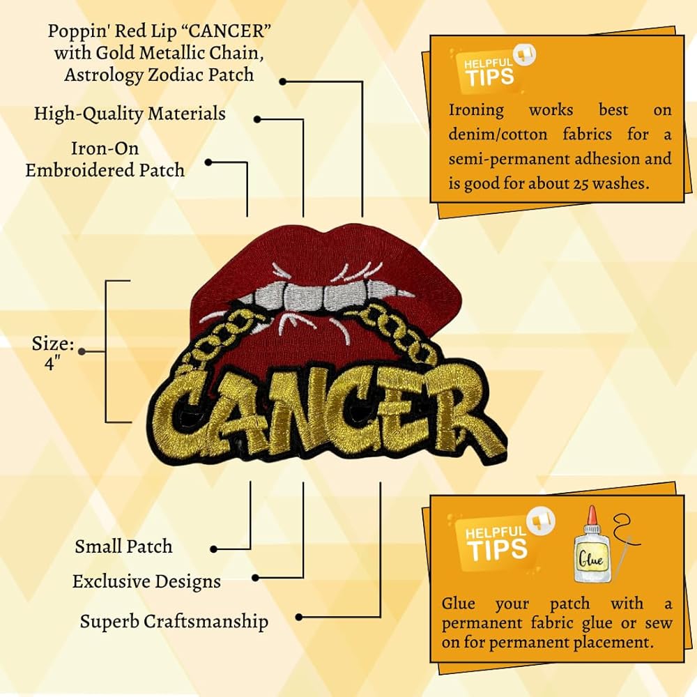 PATCHPARTYCLUB Poppin' Red Lip Cancer with Gold Metallic Chain, Size 4", Iron-On Embroidered Patch, Astrology Zodiac Patch, DIY