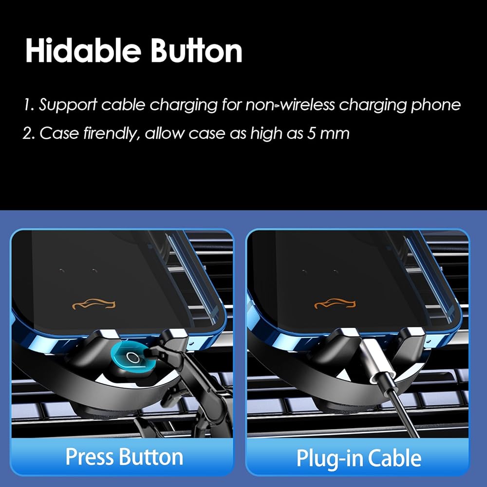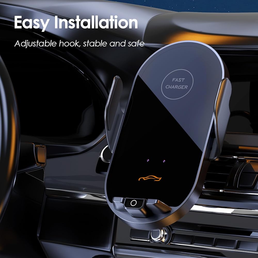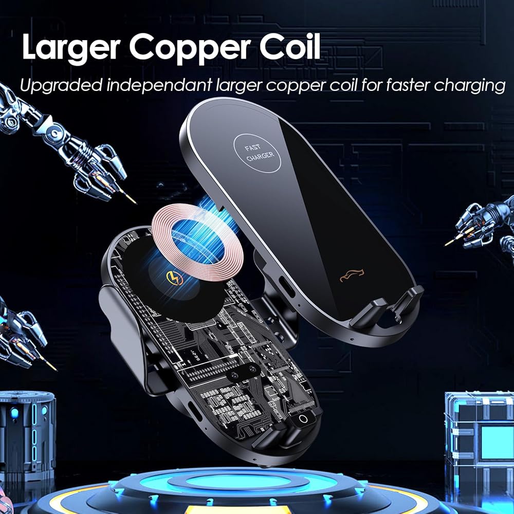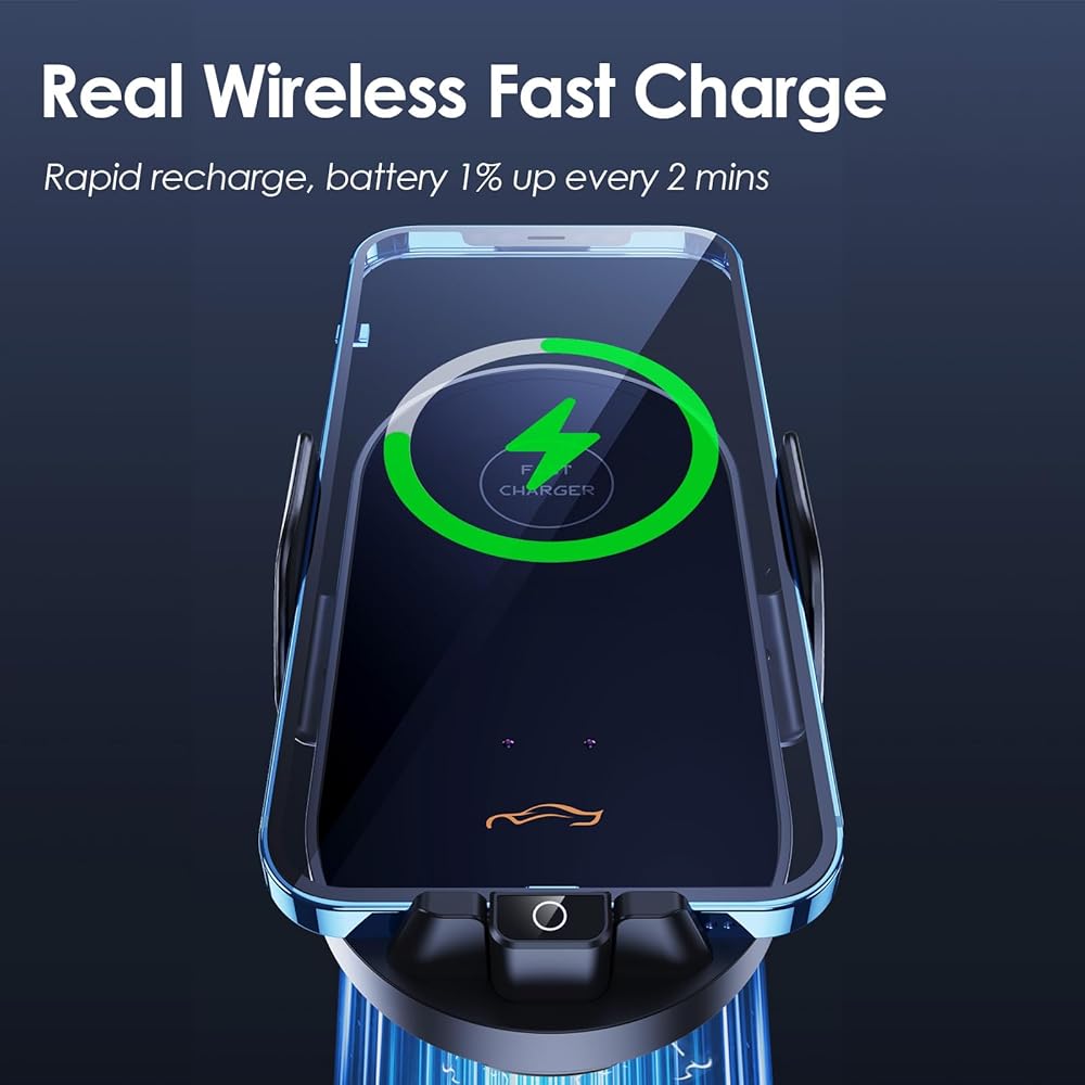 🚗 Robotic Clamping Feature: Effortlessly secure your smartphone with our robotic clamping cell phone mount. Simply place your hand near the sensor to open the clamp. And touch the back sensor to release your phone (even after the engine is turned off as battery built-in).