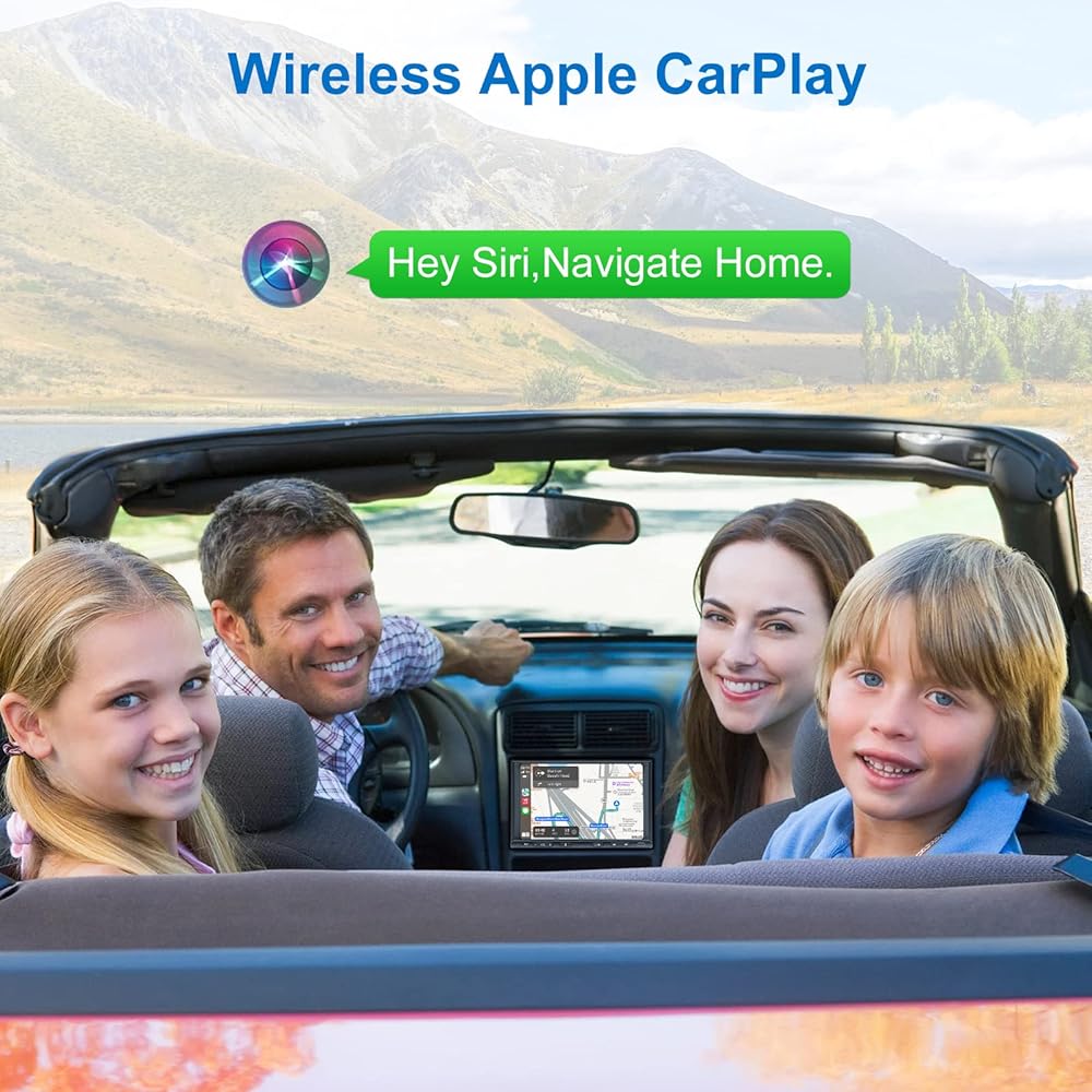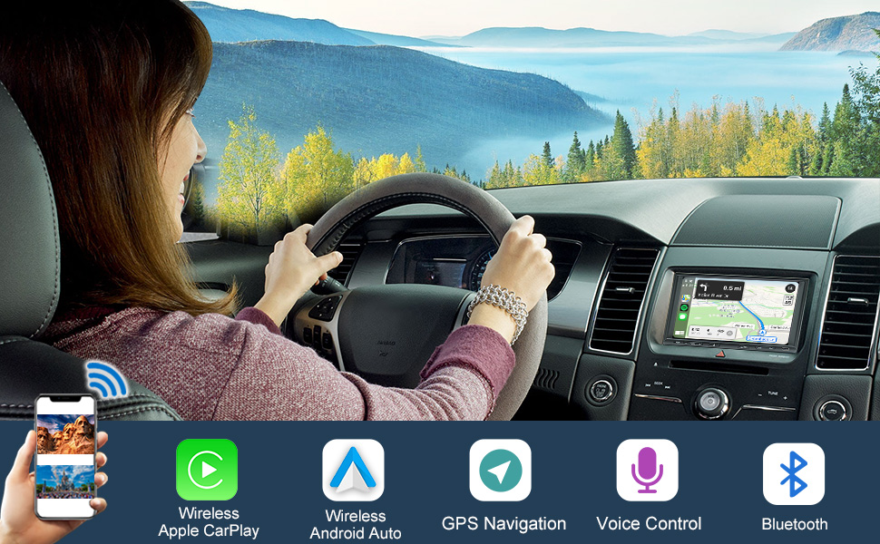 [ Wireless Apple CarPlay and Wireless Android Auto ] - Touch screen car stereo with wireless Apple CarPlay & wireless Android Auto, Siri or Google just become your personal assistant on your journey; apple car play radio will help you make/return and listen to voicemails calls, send/read and reply to text messages, access all your favorite music and track information right on your double din radio, and find the quickest routes to your destination onto your android car stereo