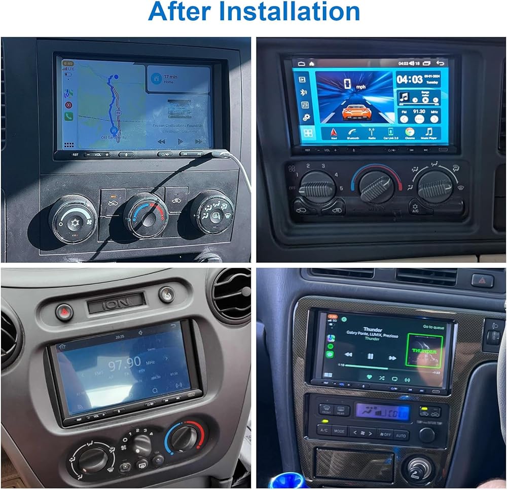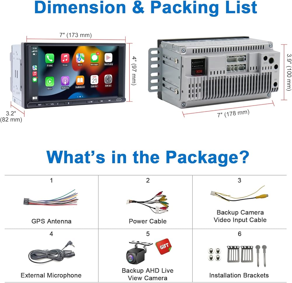 [ Vehicle Fit ] - Our car stereo double din is the U.S. standard size 173×98mm(6.81×3.85inch), carplay screen is compatible with almost all dash kits with a double din opening Note: Some cars may need buy extra wiring harness, frame dash kit (mounting kit),wire harness adapter, radio antenna adapter, canbus decoder to make our double din apple carplay well fit your car, this available from Metra, PAC, Scosche