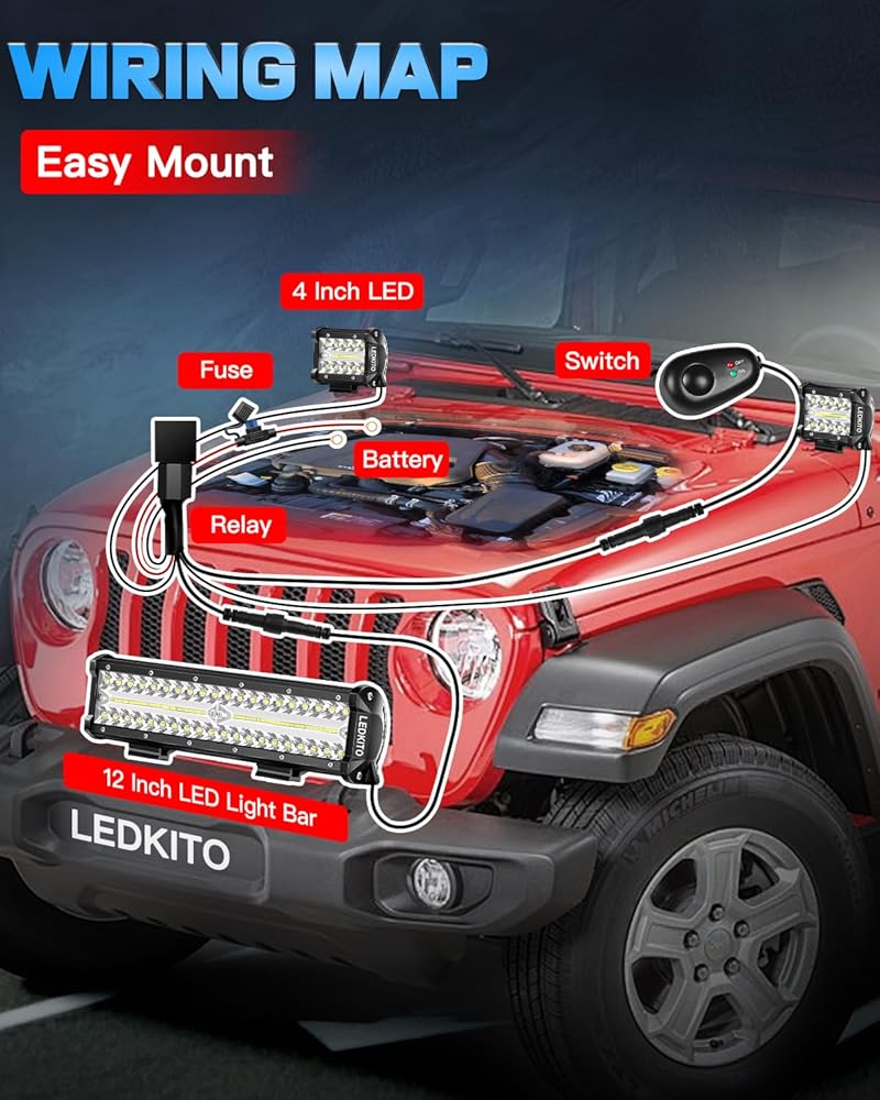 【Wide Application】LEDKITO 12 Inch Off Road LED Light Bar and 2PCS 4 inch LED Light Pods Kit Suitable for Je-ep,Various Off Road,SUV,ATV,UTV,Trucks,Boat,Golf Cart,Tractor,Van,Side by Side with DC 12V Power Supply.The 12 Inch LED Bar Light & 4 Inch Pod Lights Kit is Perfect to Be Used As Off Road Light,Work Light,Fog Light,Driving Light, etc.