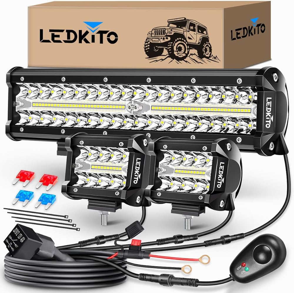【Complete Off Road Lights Kit】LEDKITO 12 Inch LED Light Bar and 2PCS 4 Inch LED Pods Off Road Lights Kit With Switch 16AWG 3 Lead Off-road Wiring Harness Kit[With Screws Down Caps for Waterproof,Quickly Connection,Inline Maximum Voltage DC 12V/40A Relay & 30A Blade Fuse],The Switch Can Prevent to Drain The Battery.The 12" LED Off Road Light Bar and The 2PCS 4" LED Work Light Pods With Sliding Mounting Base Brackets,45° Up & Down Adjustable!Easy to Wiring And Mount to Front Bumper,Roof Rack,Hood.