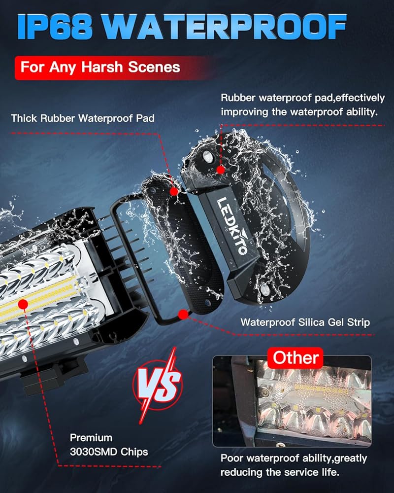 【Outstanding Waterproof Performance】Silicone Ring Sealed PC Lamp Cover and Silicone Side Cover Gasket Sealed Body,IP68 Waterproof & Dustproof.The Off Road Wiring Harness With Scres Down Cap Connectors for Waterproof.All Full Sealed Design to Allow the 12in LED Bar Light and 4 Inch LED Cube Pods Works in Any Harsh Weather and Conditions:Rain,Dency Fog,Snow,Mud,Wading,Even Frozen.Extend Over 80,000H Lifespan.