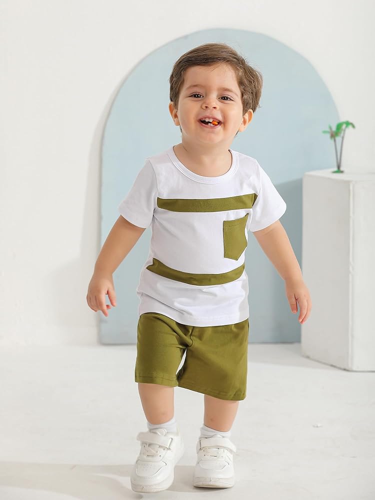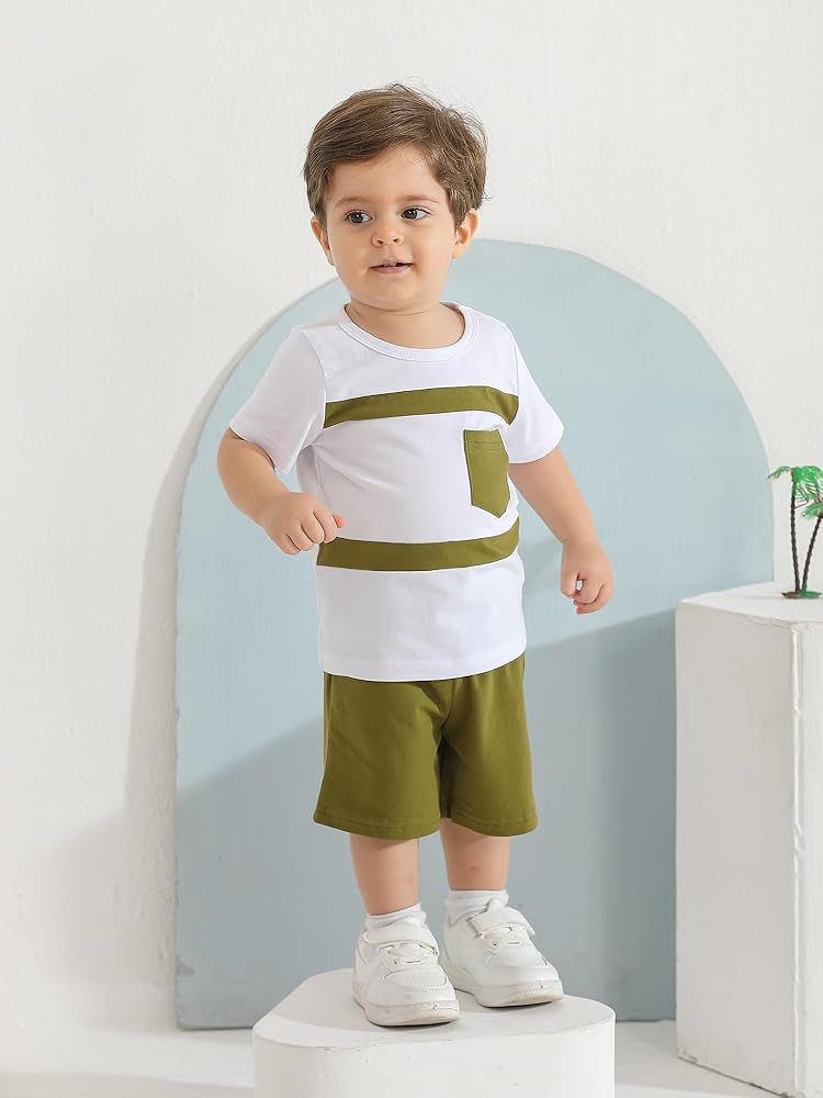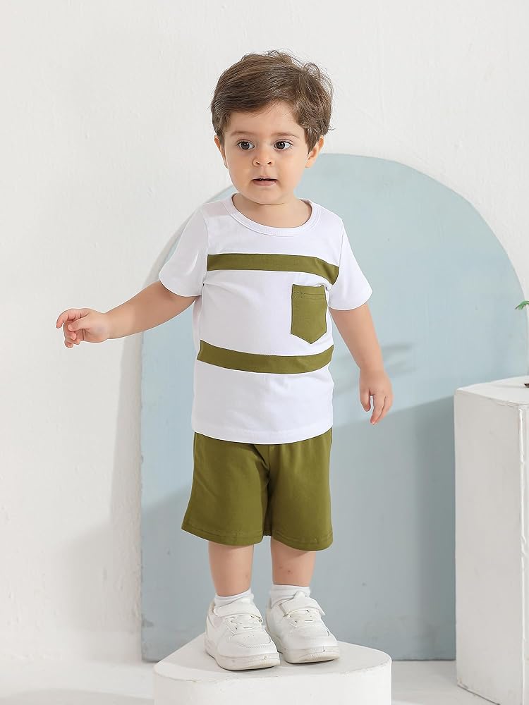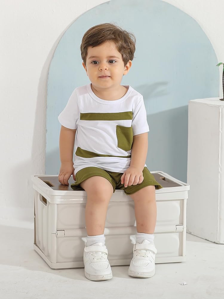 Baby boy summer shorts set, short sleeve crewneck t-shirt with pocket in the front, pair with solid color drawstring short pants. Well made and unique design, baby boy shorts and tshirt.