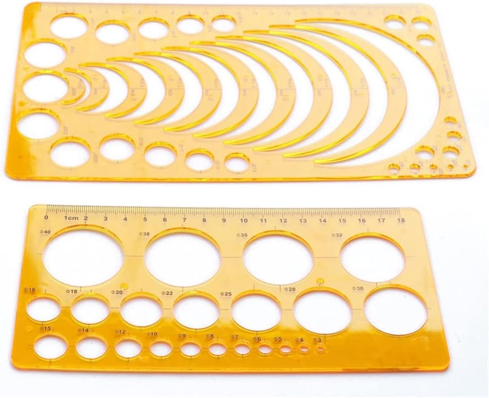 material: plastic Color: yellow Size : 23cm/9in and 18cm/7in.The templates are 1.5 mm thick Quantity: 2 pieces (1PC radius template, 1PC circular template.)Wide range of applications:These rulers have different shapes, and different shapes can draw different works, which is very practical.They are suitable for architecture, network technology, score measurement, art design or as a drawing template for school learning.