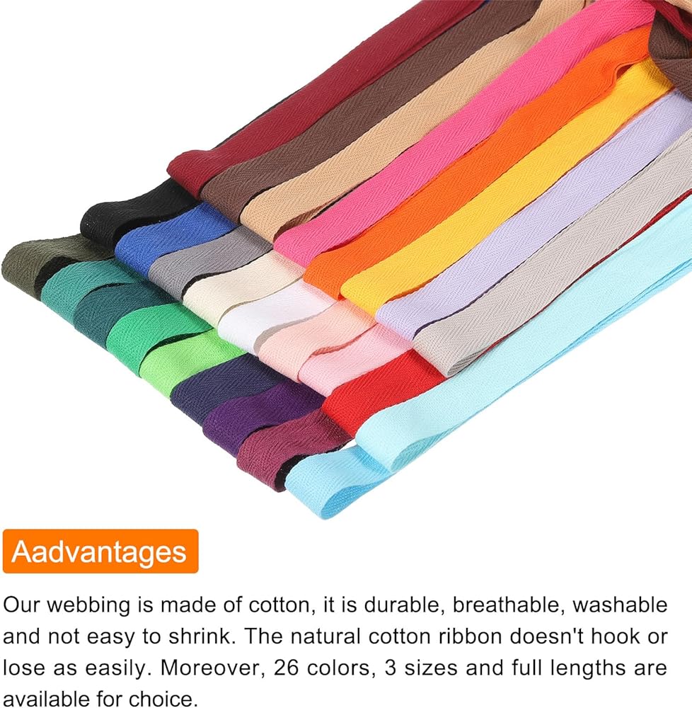 Our webbing is made of cotton, it is durable, breathable, washable and not easy to shrink. The natural cotton ribbon doesn't hook or lose as easily. Moreover, 26 colors, 3 sizes and full lengths are available for choice.