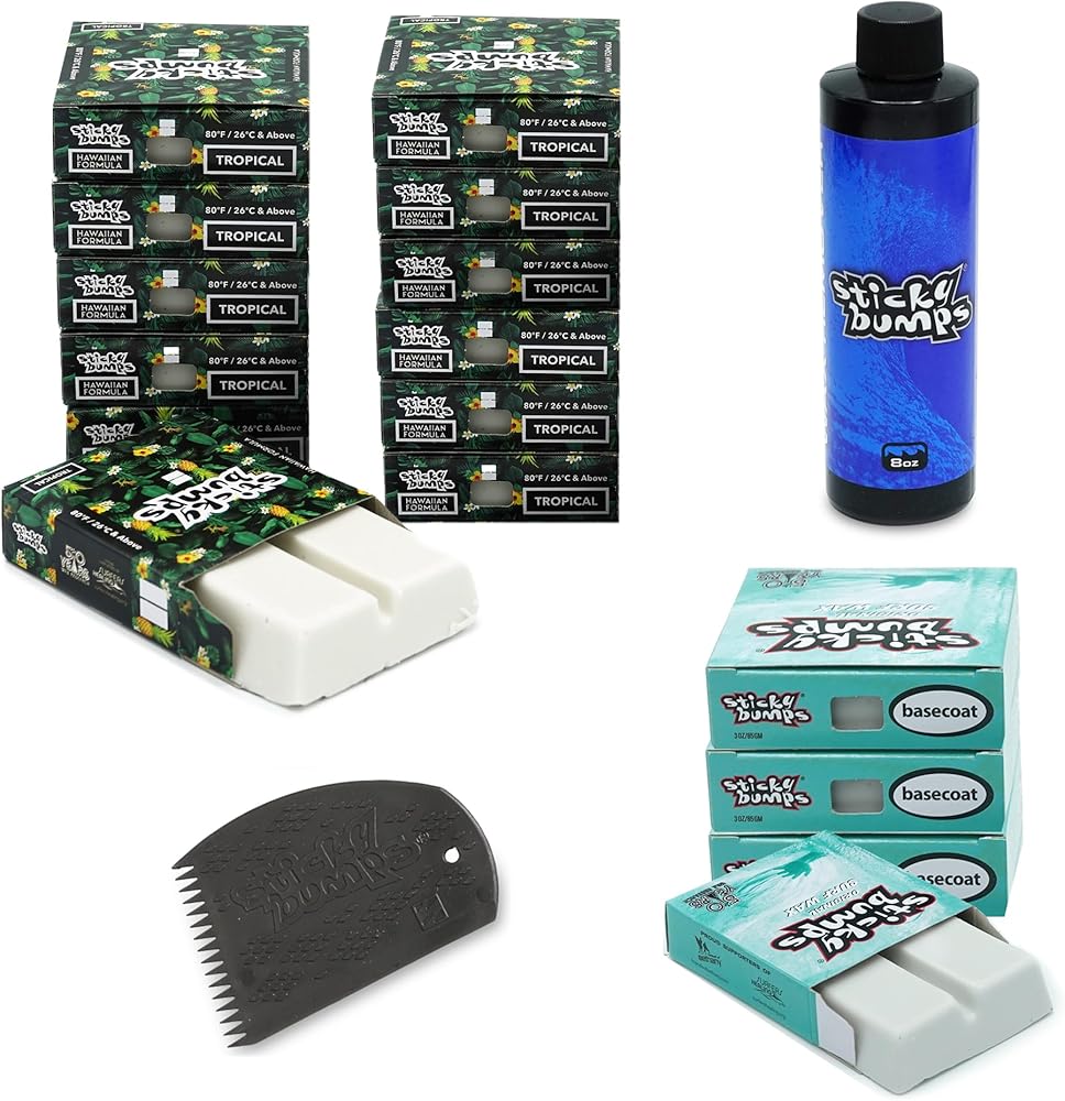 12 bars in boxes Sticky Bumps Original Hawaiian Tropical Wax Long lasting and easy to apply. Optimal for water temps 80°F and above. Product Details Pina Colada Scent Non-Toxic / Biodegradable / All-Natural Temperature Rating | HI Trop - For water temps 80°F / 26°C and above. For Best Performance – Use Sticky Bumps basecoat under any of their temperature-specific waxes. Specs Temperature Range: Hawaiian Tropical Weight (g):85