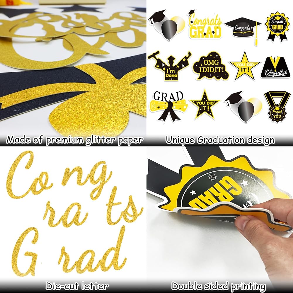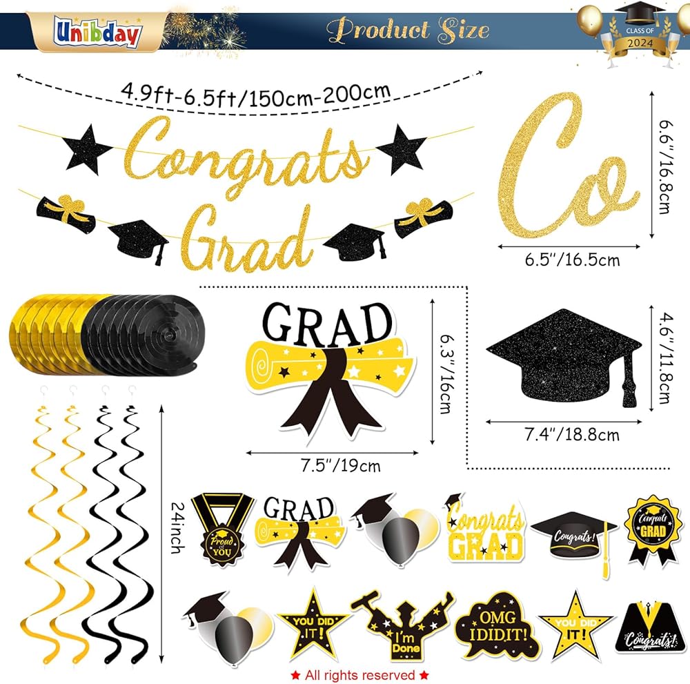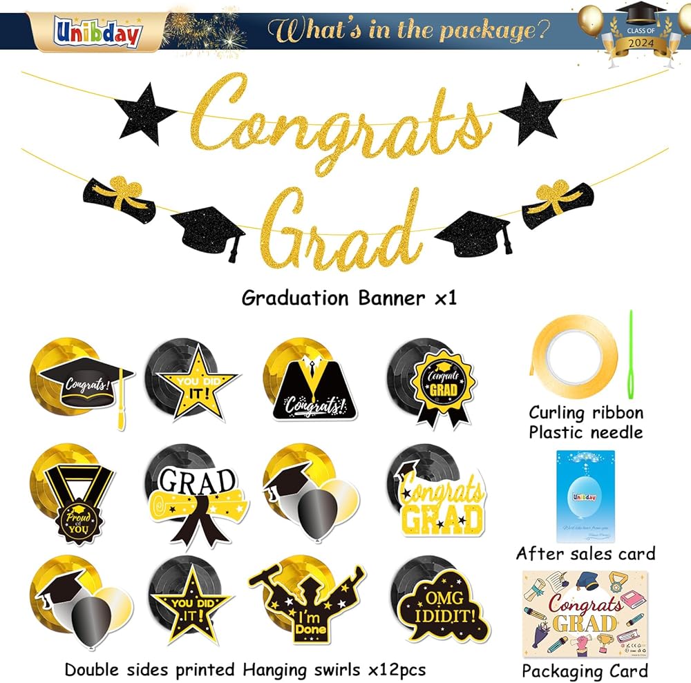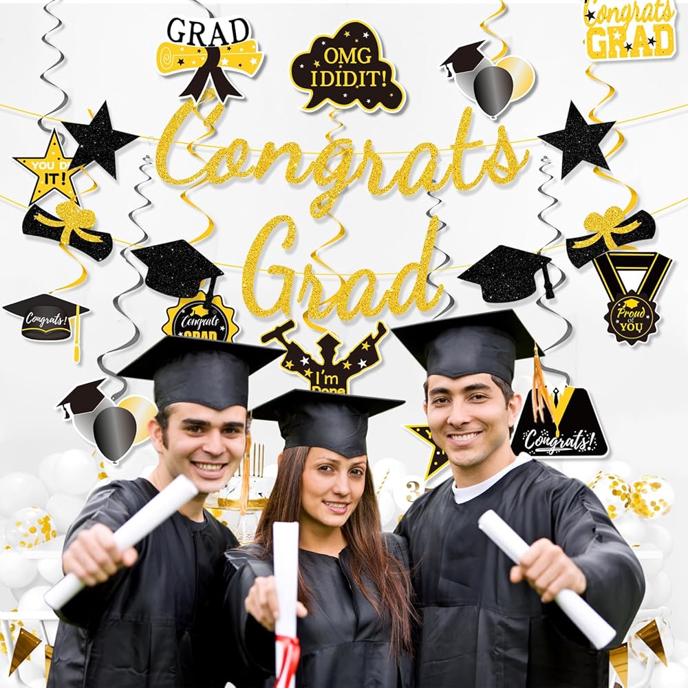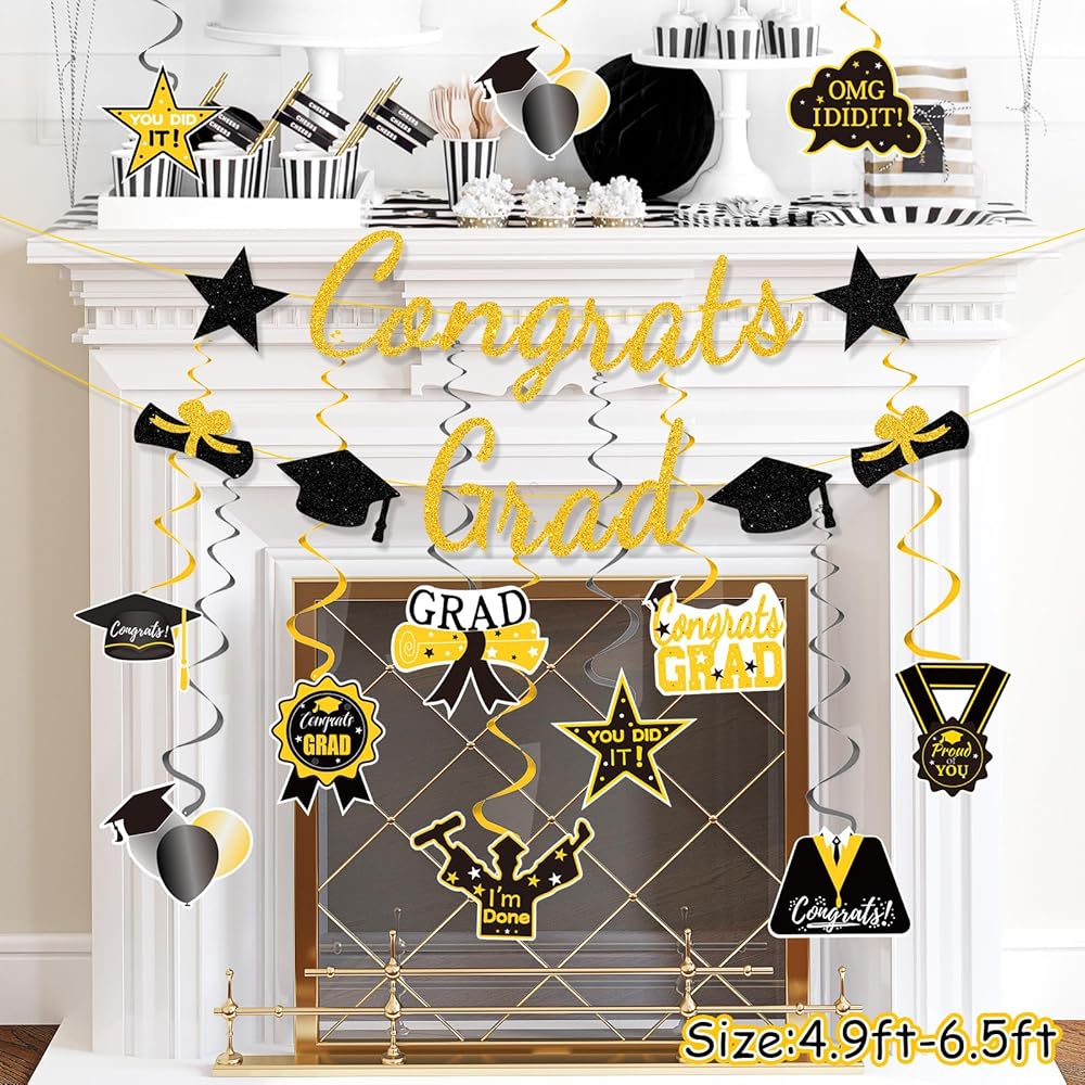 Graduation Decorations Class of 2024, Graduation Party Supplies with Hanging Swirls, Graduation Party Decorations 2024,Gold GlitterCongrats Grad Banner for Congratulation Graduation Party