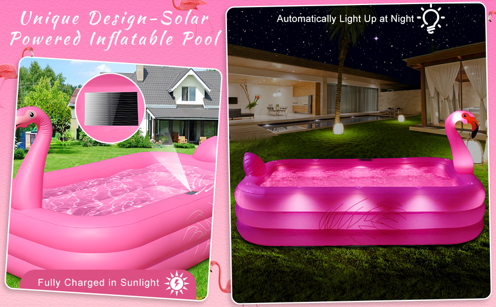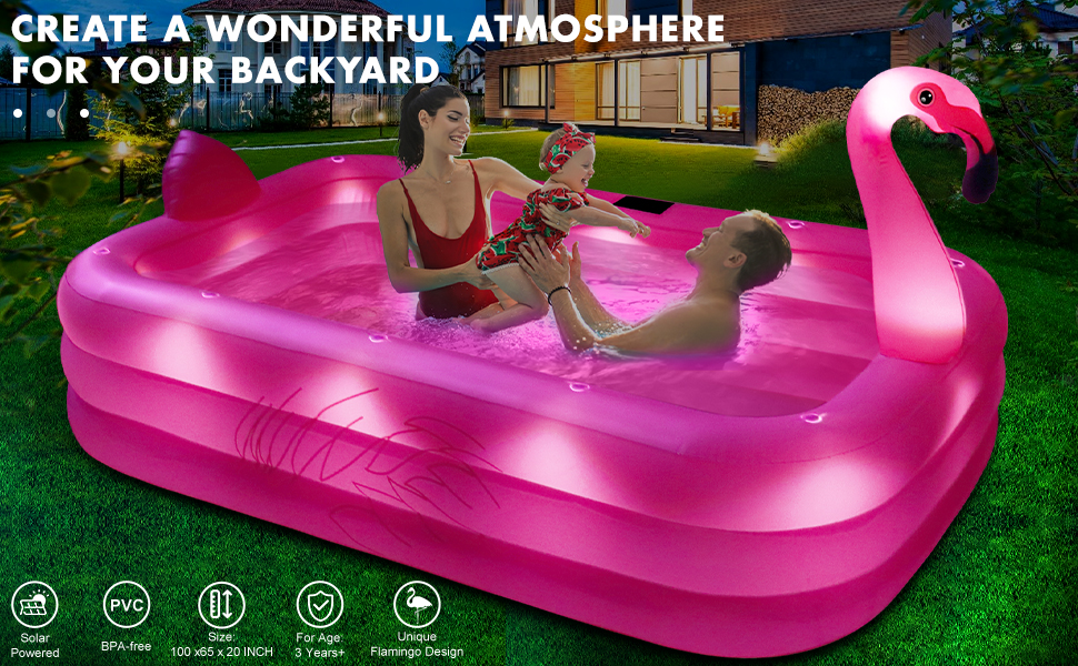 【Your Dream Inflatable Pool】Unlike ordinary inflatable pool without lights on the market. Our Unique & Patent inflatable swimming pool is a new product developed by our team as a result of our Voice of the Customer program. It simply charges up in the sun and automatically lights up once it senses darkness. With up to 8 hours of lighting that elegantly light up your evenings after fully charged.