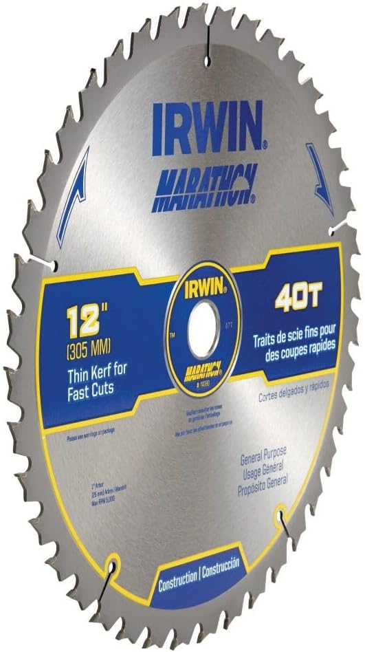 The Irwin Marathon 12-Inch 40-Tooth Miter/Table Saw Blade is designed for optimal performance with miter and table saws where a smooth finish and accurate cuts are critical. This thin kerf blade features carbide-tipped teeth and a hardened steel body to deliver a long cutting life. Other features include a reinforced shoulder and heat vents that reduce unwanted blade warp.