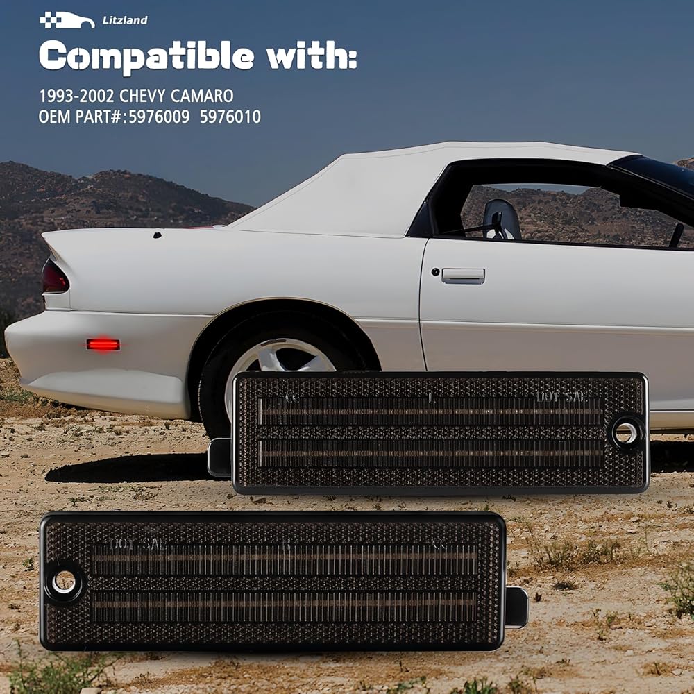 Compatibility: 1993 1994 1995 1996 1997 1998 1999 2000 2001 2002 Chevy Camaro RS, Z28, Z28 SS Coupe Convertible (OEM Part NO#5976009, 5976010 ) rear side marker turn signal lights for both of the driver/passenger sides. Upgrade your side strip parking light assembly with Euro dark smoked lens sidemarker lamps for Gen 4th Camaro.