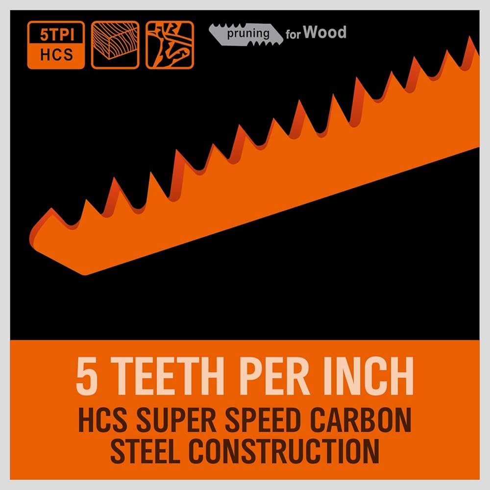 - 5 Pack 9-Inch Wood Pruning Reciprocating, 5 teeth per inch.