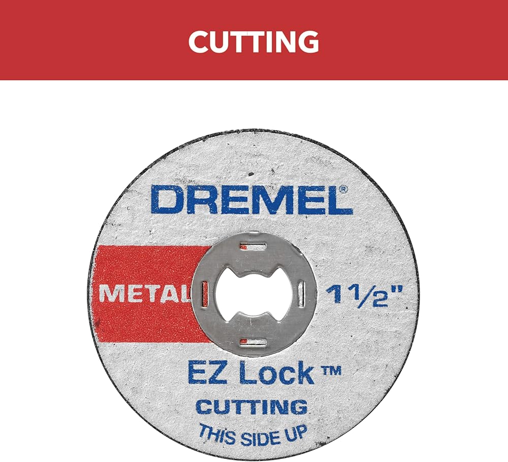 The Dremel 1-1/2-Inch EZ Lock Rotary Tool Cut-Off Wheels make it easy to cut through metal. These reinforced cut-off wheels last up to two times longer than typical fiberglass wheels. These wheels can be used for cutting metal conduit and PVC piping, reslotting screw heads, and removing rusty nail heads. The EZ Lock design makes changing accessories as easy as a pull, twist, and release, with no worry of losing a screw or needing a wrench. This pack includes five cut-off wheels.