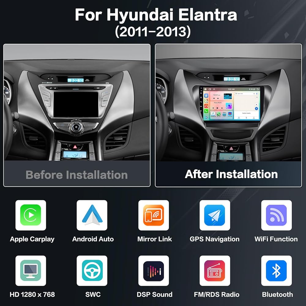 🚨[𝐀𝐩𝐩𝐥𝐢𝐜𝐚𝐛𝐥𝐞 𝐌𝐨𝐝𝐞𝐥𝐬 & 𝐘𝐞𝐚𝐫𝐬] This upgraded replacement dash kit is for hyundai elantra 2011 2012 2013. The stereo comes with an in-dash head unit, wiring harness cables and frame panel. Cable does NOT support the original car with amplifier (Purchase If Needed). Please check if the power cable port on the detail page matches your original car before purchasing.