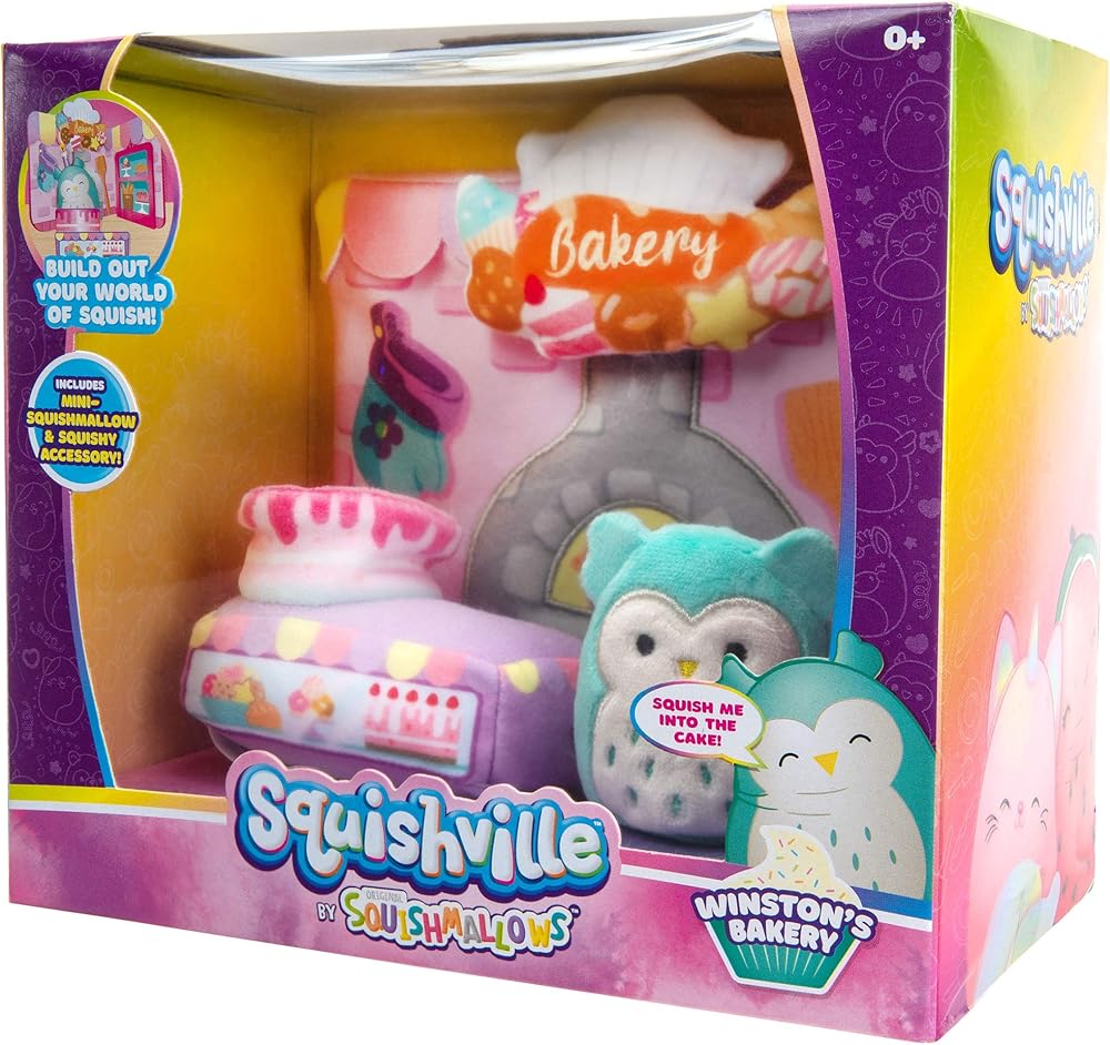 Next Stop: The Squishville Toy World. Squeeze Into The Squishville Toy World With The Squishville Bakery Playset. This Adorably Squishy Playset Features Your Favorite Squishmallows Plush In A Mini 2-Inch Size. Expand Your Squishville Toy World And Squeeze Your Mini-Squishmallow In And Out Of The Cake On The Bakery Counter. The Plush Squishville Toy World Is Made With Super-Soft Marshmallowy Filling Making It The Coziest Place On Earth. This Playset Comes With A Winston Mini-Squishmallow Plush To Add To Your Plush Collection, And A Plush Accessory. With Vehicles, Playsets, And Your Favorite Squishmallow Plush Characters, The Squishville Toy World Is Bursting With Squish-Ibilities.