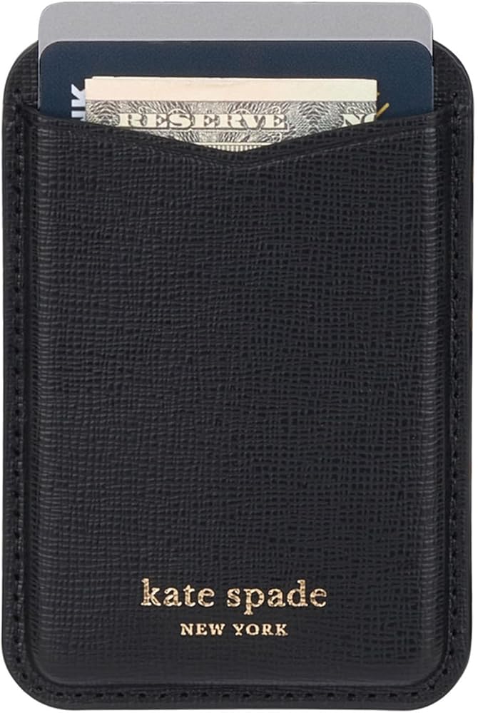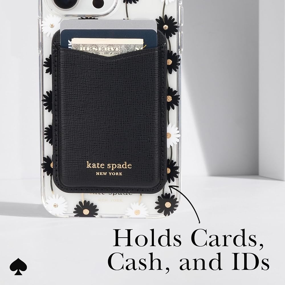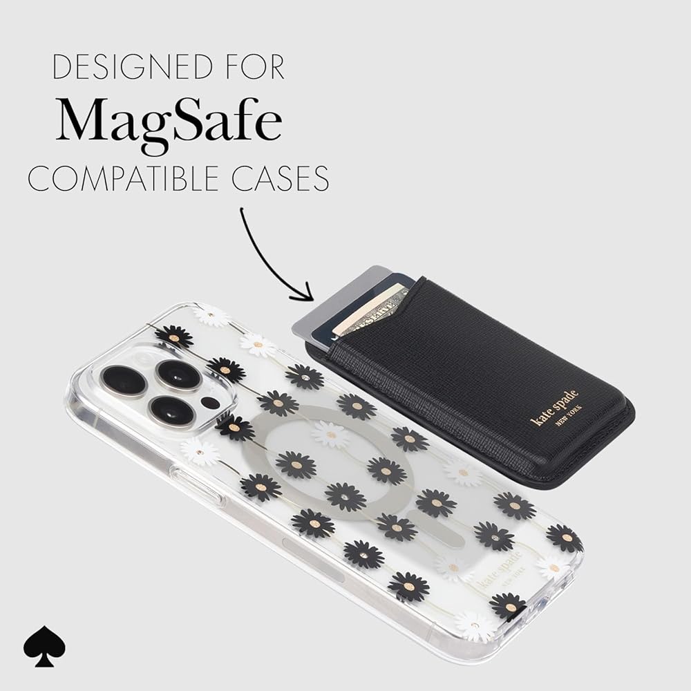 Kate Spade New York magnetic wallet offers a secure hold, supporting up to 3 times the weight of your iPhone. Crafted with Pebbled Vegan Leather, it holds 4 cards and cash with ease. The design includes precise cutouts, and a magnetic closure, and is made exclusively for MagSafe-compatible devices.
