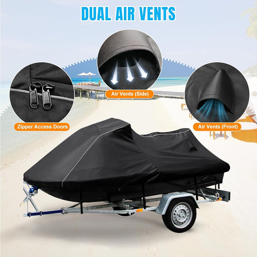 【Upgrade Designs】(1)A black waterproof zipper for convenience (2) Dual Rear air vents reduce inside moisture and wind lofting. (3) Waterproof pu Coating: super Waterproof , UV protection and heat-proof,prevent cracking and aging of inner decoration leather and plastic. (4)It comes with 3 adjustable straps at the bottom, and a storage bag. (5)Double-stitched & Waterproof Strip make the Jet Ski cover better waterproof, no water seepage. (6)A storage bag included in package.