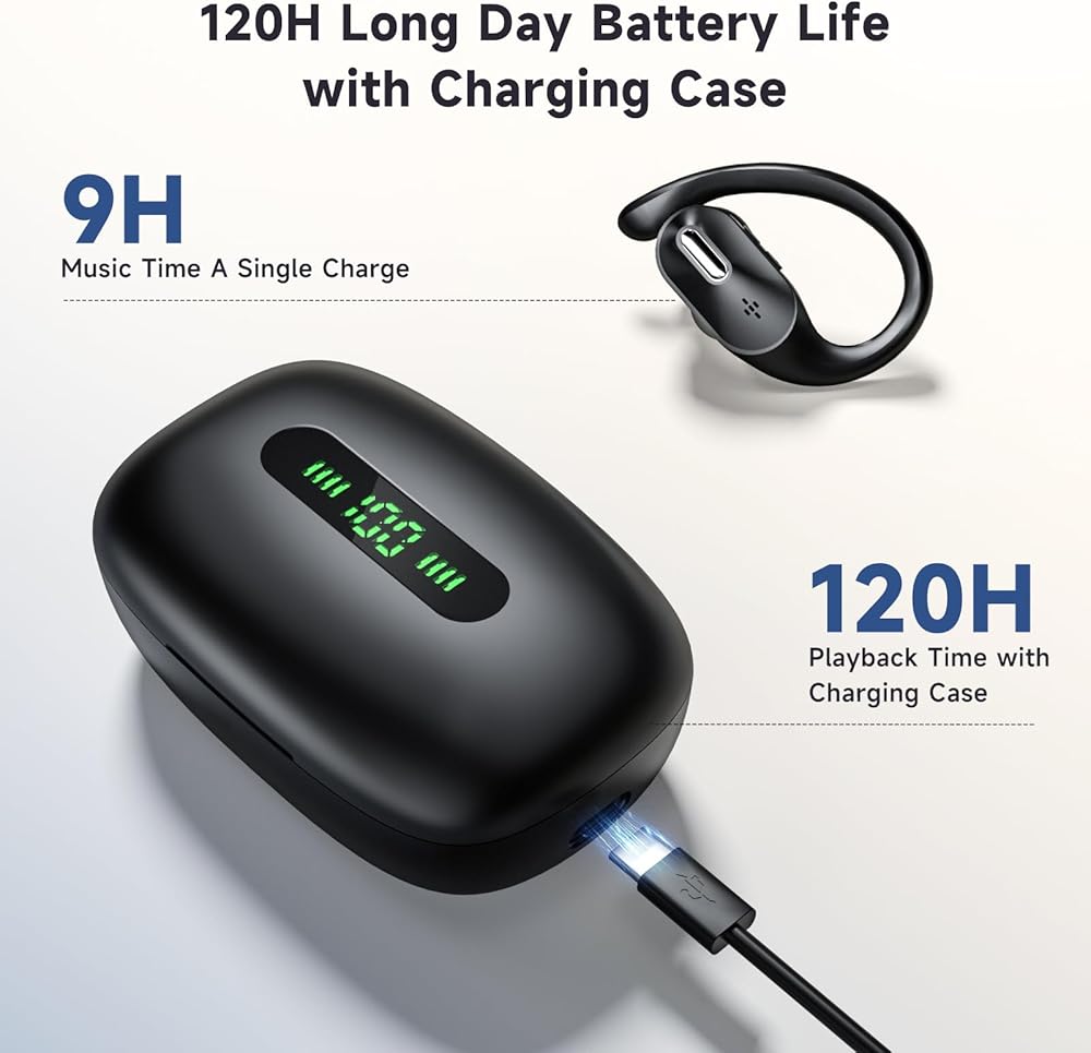 【120H Standby Time &Emergency Power】:Wireless Bluetooth earbuds with a charging case have a playback time of up to 120 hours, and a single full charge of the wireless headphones allows for 9 hours of playback. The ultra large capacity 1200mAh charging case of the Bluetooth wireless headphones can serve as an emergency power source for your phone, helping you provide emergency power to your phone.In addition,The charging case supports USB C charging.