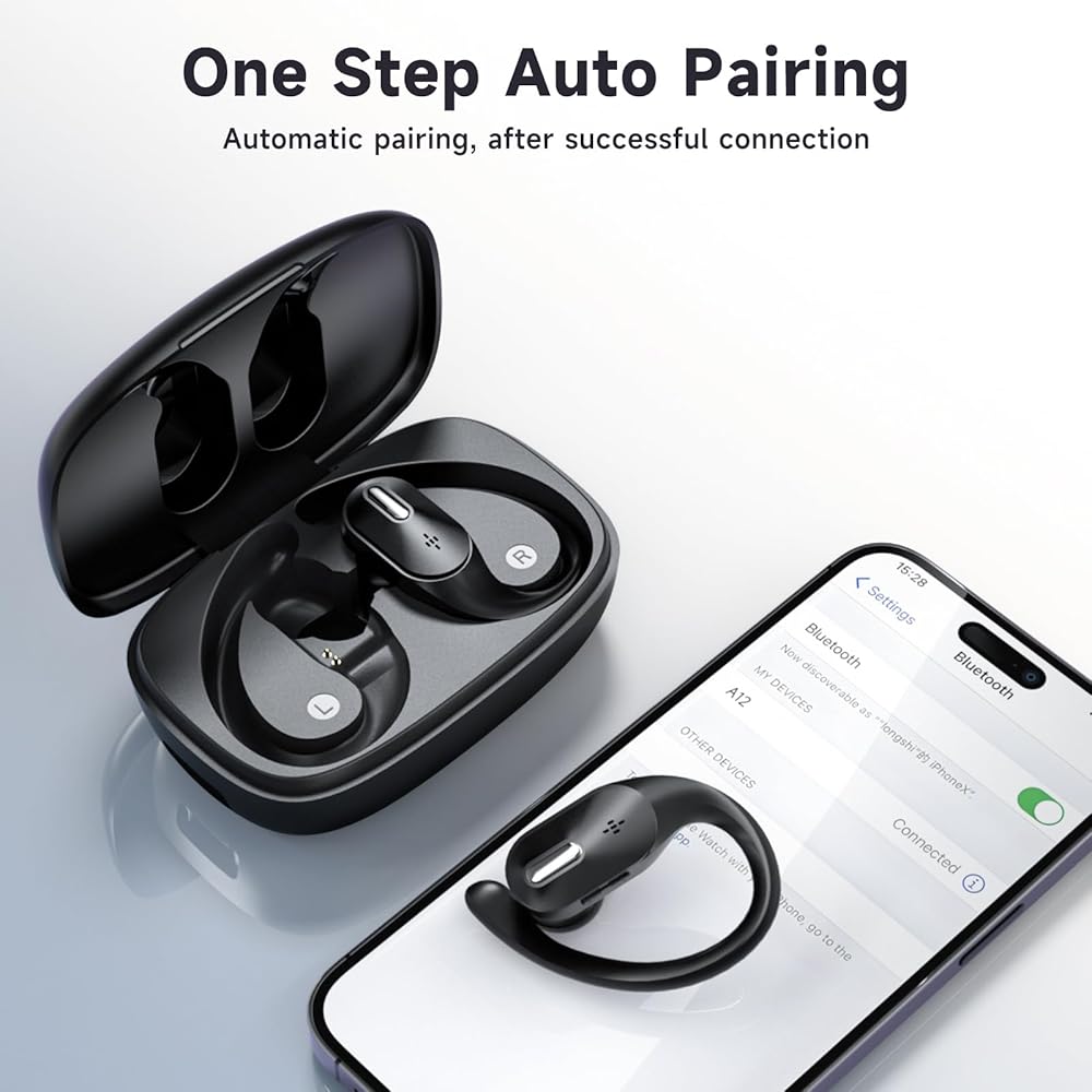 【Ergonomic Design for sport& IPX 5 WaterProof】:The A12 wireless headphones feature an ergonomic design with comfortable and soft ear hooks, providing a secure fit during sports activities without falling off. And multiple sizes of ear tips (S/M/L) are provided for you to choose from, offering a better wearing experience according to your preferences. Constructed with IPX5 waterproof material, these bluetooth earbuds allow you to exercise without worrying about sweat entering the earbuds.